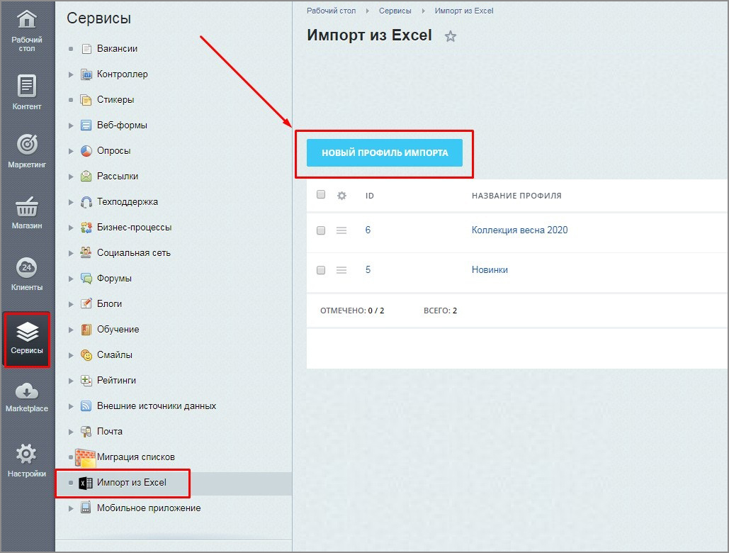 После установки модуля в административной части в разделе Сервисы появится новый пункт — Импорт из Excel. При переходе в этот пункт меню откроется страница с профилями импорта (их можно создать несколько).