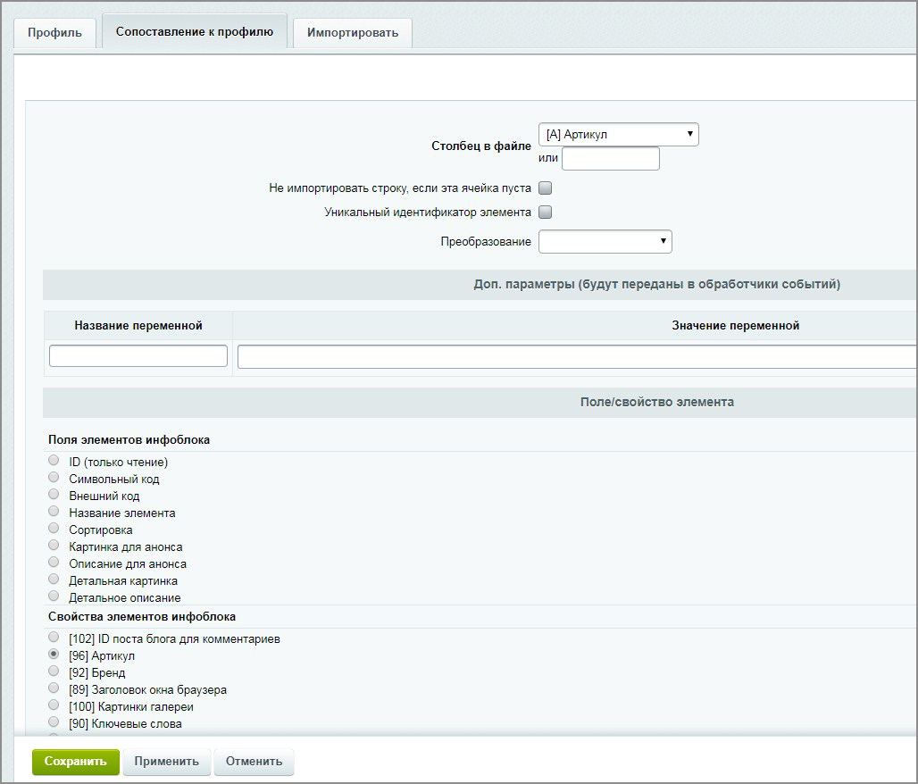— Поле/свойство элемента: в этом разделе представлены три области для выбора сопоставления — Поля элементов инфоблока, Свойства элементов инфоблока, Торговый каталог. То есть выбранный столбец может быть импортирован в одно из полей или свойств элементов инфоблока или в торговый каталог. Установите переключатель в один из пунктов представленных областей.