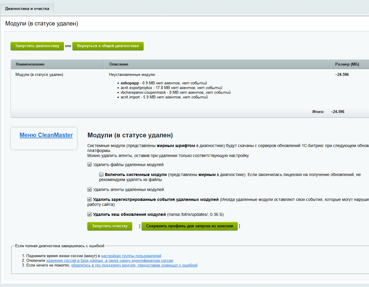 25. Удаление неиспользуемых модулей (в статусе удален). Можно удалить как системные, так и сторонние модули. Также можно очистить зарегистрированные события и агенты удаленных модулей, а также почистить специальный кэш обновления модулей.