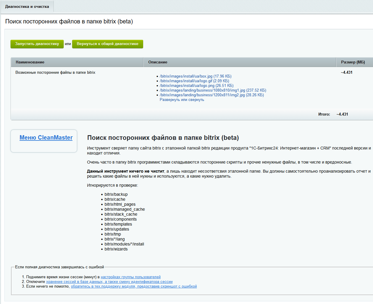 34. Поиск посторонних файлов в папке bitrix. Инструмент сверяет папку сайта bitrix с эталонной папкой bitrix редакции продукта "1С-Битрикс24: Интернет-магазин + CRM" последней версии и находит отличия.