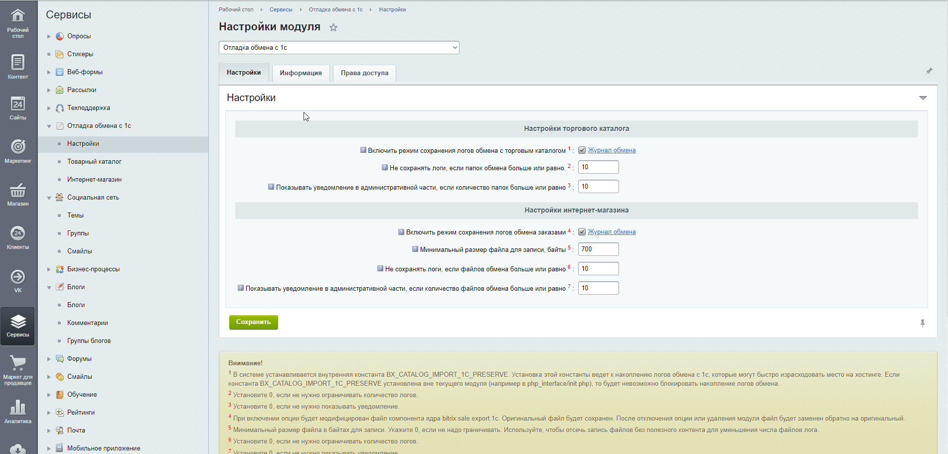 Функционал модуля позволяет просто включать логгирование обмена номенклатурой торгового каталога и обмена заказами модуля интернет-магазин.