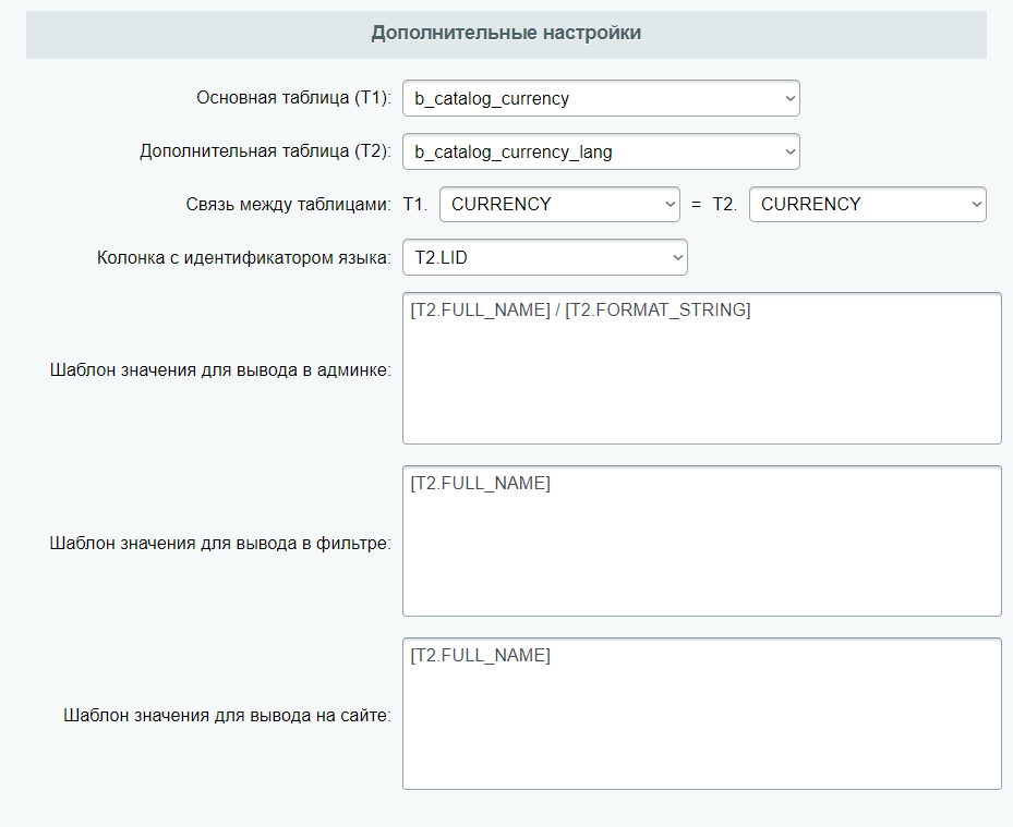 Шаблон значения для вывода в админке - настройка отформатированного значения. Может содержать любые данные из таблиц T1 и T2. Для получения данных используется конструкция с квадратными скобками и названием столбца, например: [T1.NAME], [T1.CODE], [T2.XML_ID]. Поддерживает html.