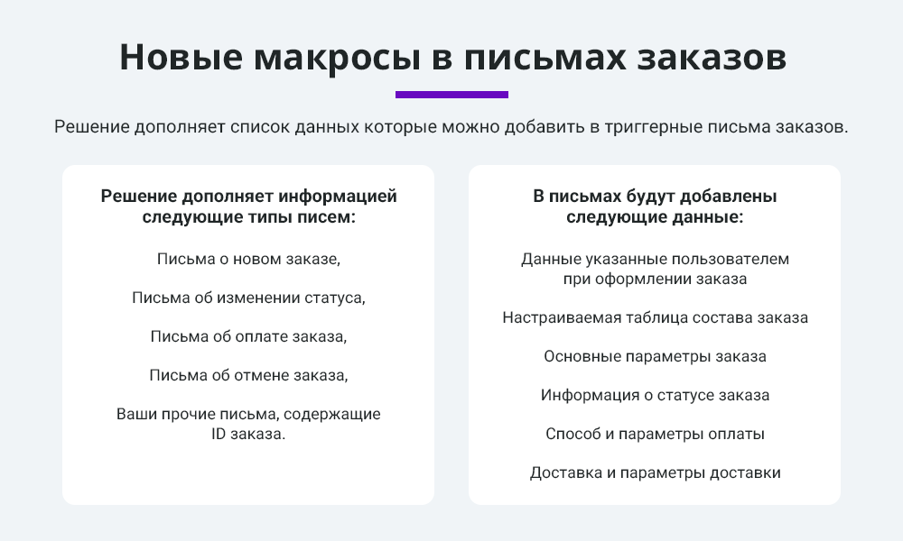 "Расширенные письма заказов: свойства и параметры заказа в почтовых событиях" - модуль для 1с-Битрикс, с помощью которого вы сможете расширить автоматические письма интернет-магазина, такие как Новый заказ, Заказ отменён, Заказ оплачен и письма информирования о Изменении статуса заказов, добавив в них все необходимые данные заказа.