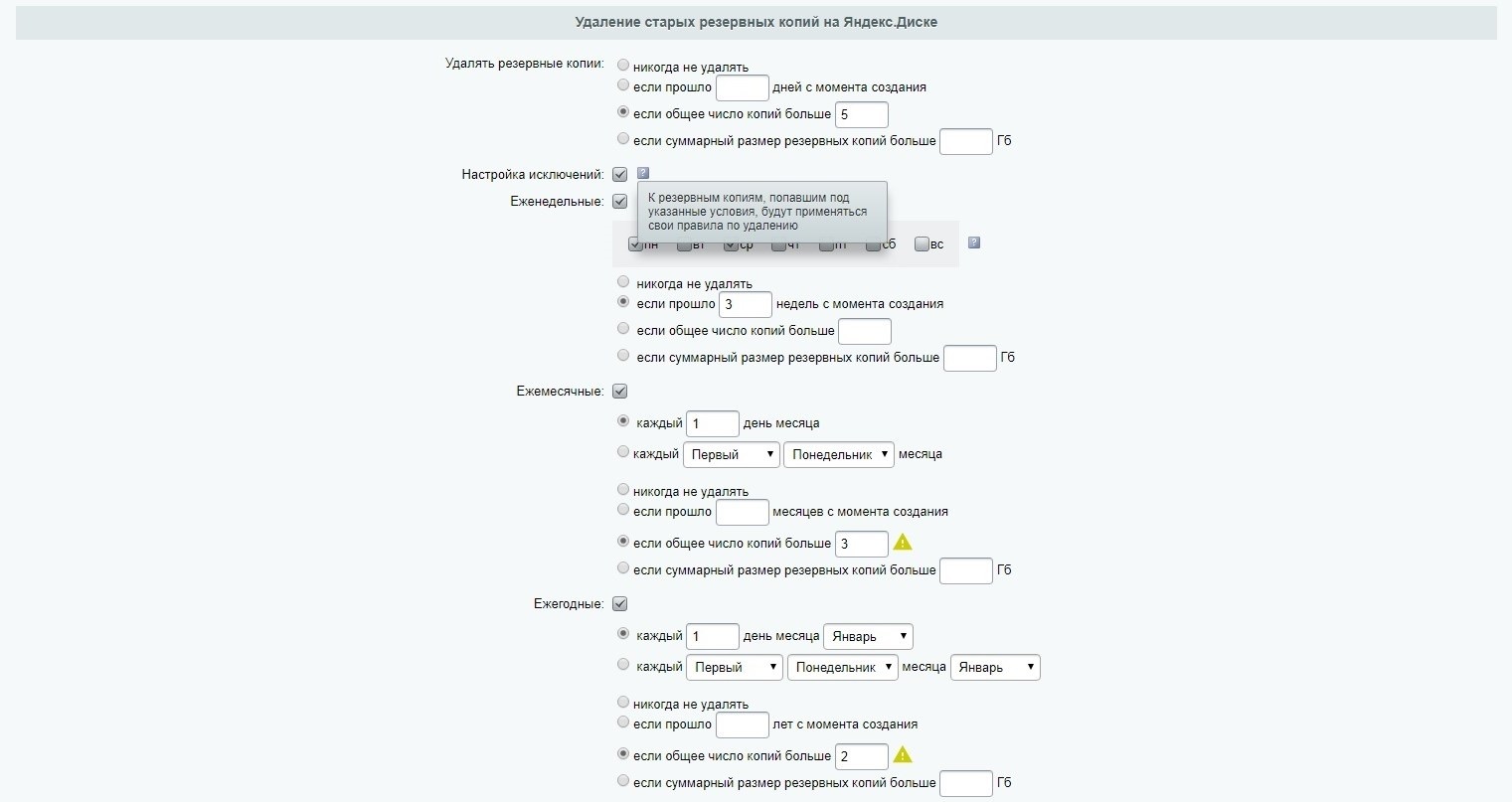- Можно настроить автоматическое удаление резервных копий на Яндекс Диске – это позволит не контролировать вручную остаток свободного пространства и эффективнее использовать доступные объемы облака.