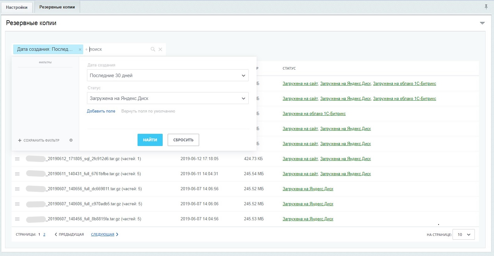- Функционал программы позволяет отображать все резервные копии, размещенные на Яндекс Диске. Администратор может видеть их параметры, а также вручную ими управлять.