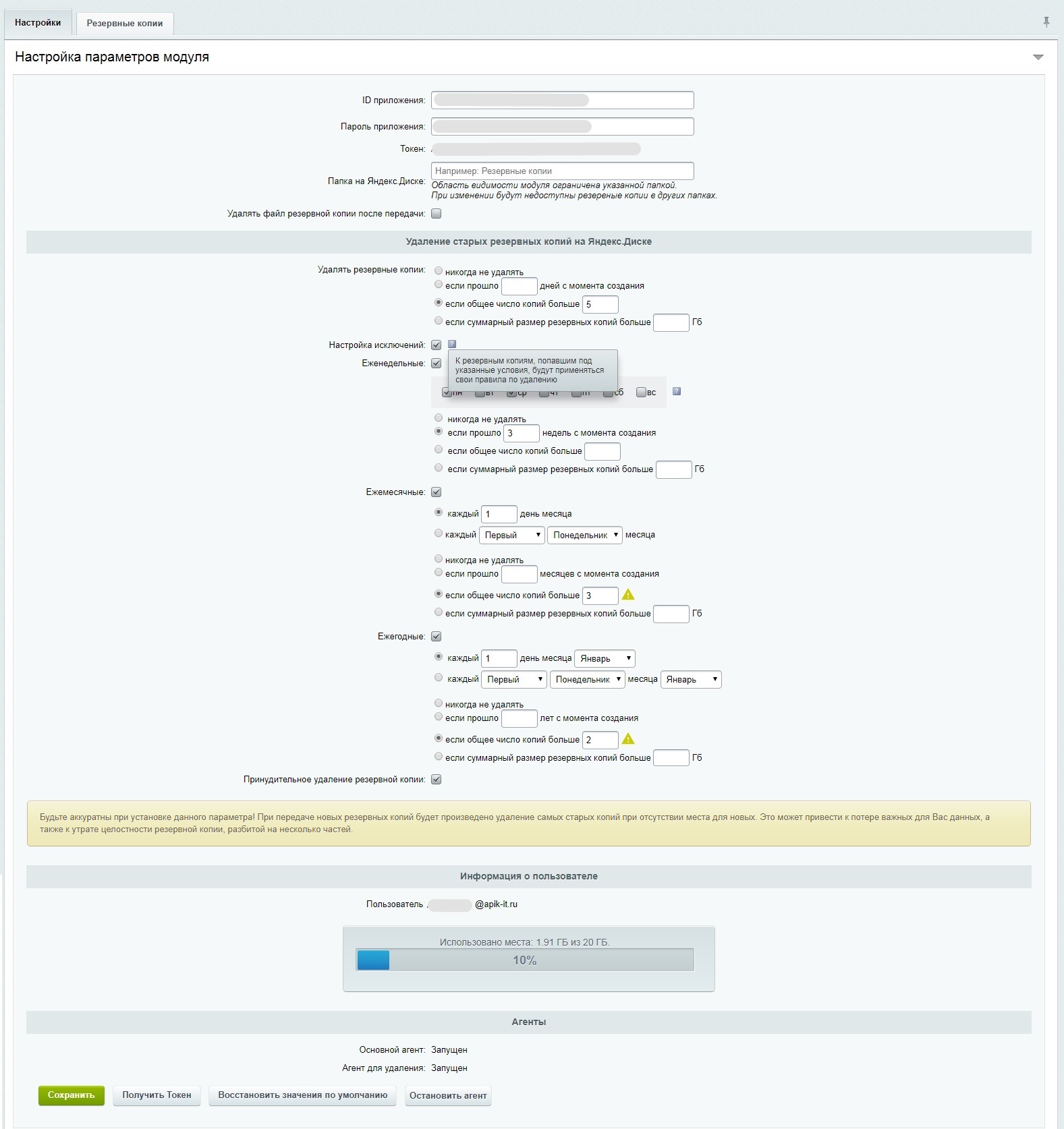 - Быстрое скачивание любой копии с облачного хранилища на сайт, удаление с него бекапов, при этом на сам диск администратор может не заходить – все действия осуществляются функционалом модуля.