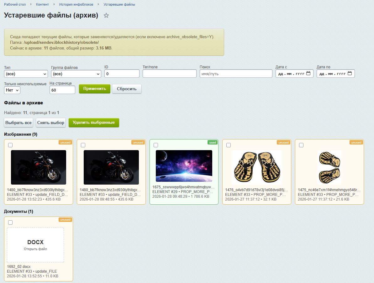 - Исключения: Возможность полностью отключить версионирование для конкретных инфоблоков или полей.