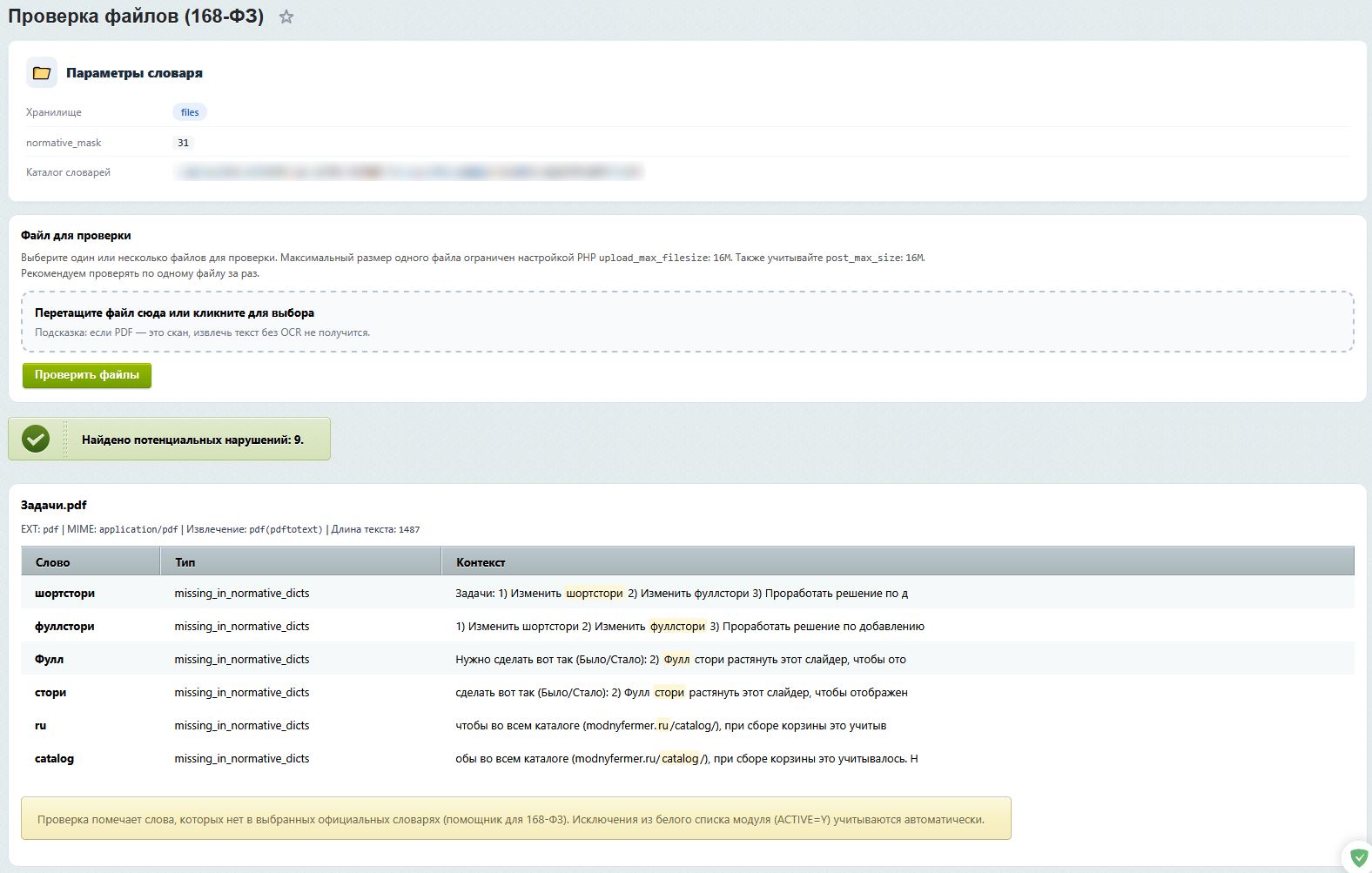 5. Что происходит с найденными нарушениями? Они сохраняются в таблицу базы данных с указанием источника (ссылка на элемент инфоблока или путь к файлу), контекста употребления и даты обнаружения. Вы можете менять их статус на «fixed» после добавления в белый список или правки контента.