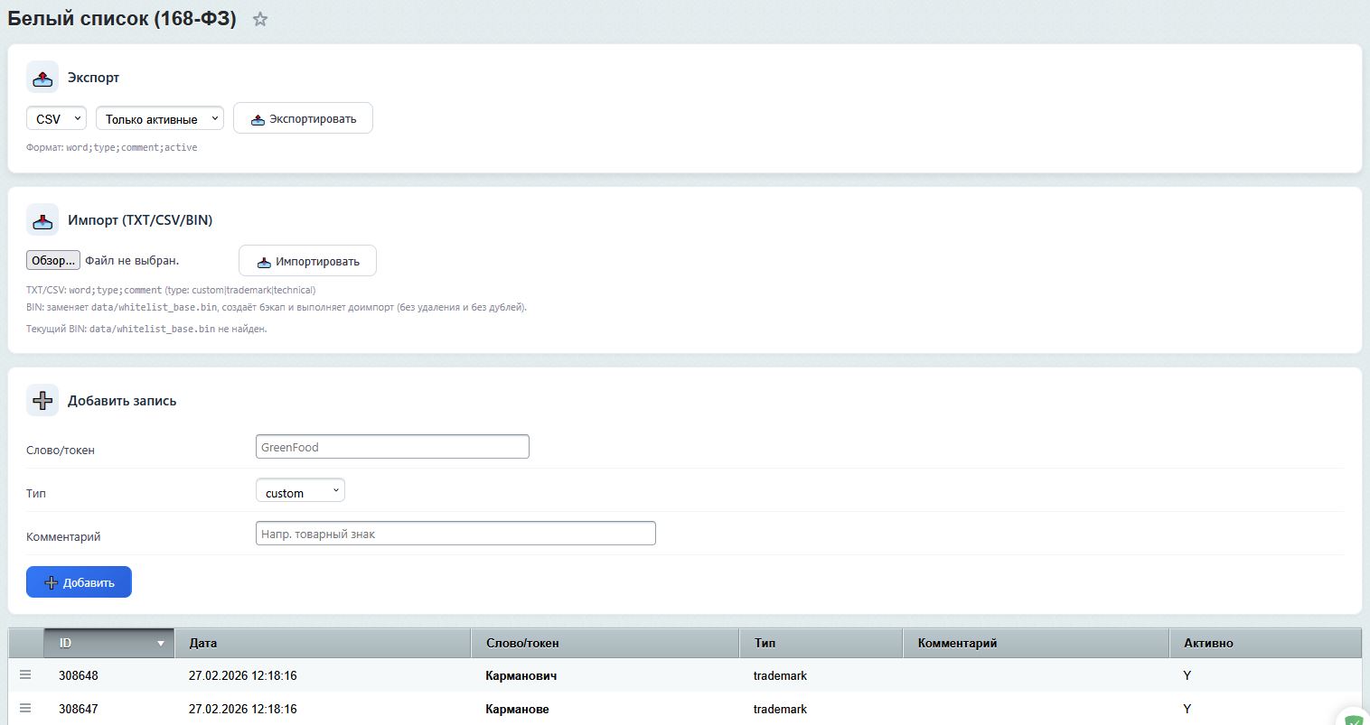 4. Поддерживается ли работа с мультиязычностью? Интерфейс модуля локализован (RU/EN). Проверка контента ориентирована на русский язык (кириллица), так как закон 168-ФЗ касается использования иностранных слов в русском тексте.
