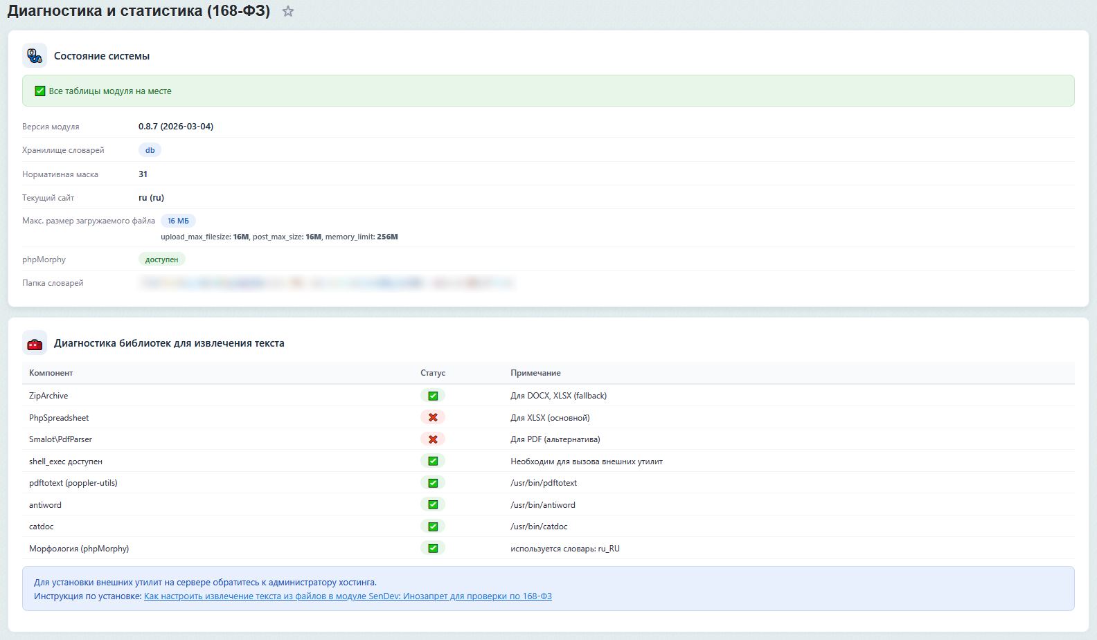 1. Требуется ли доступ к консоли сервера для работы? Нет, модуль полностью работает в рамках PHP-окружения Bitrix. Импорт словаров и сканирование доступны через веб-интерфейс. Подключение phpMorphy опционально для улучшения качества морфологии.
