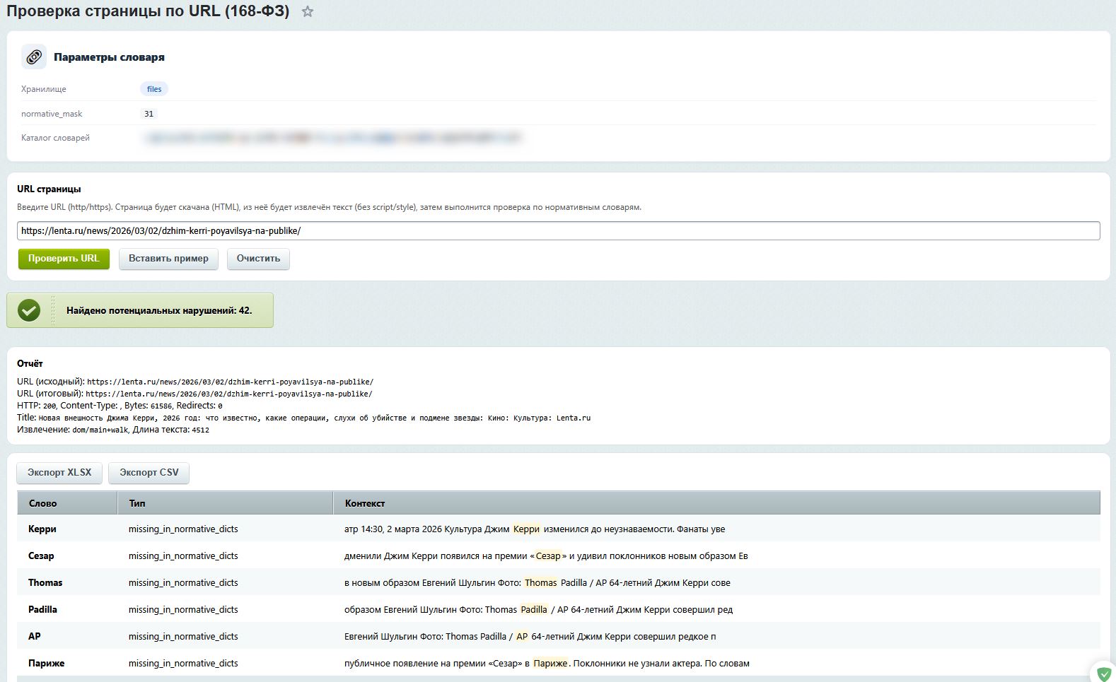 - Соответствие 168-ФЗ: Алгоритмы проверки настроены на выявление слов, отсутствующих в нормативных словарях РФ.