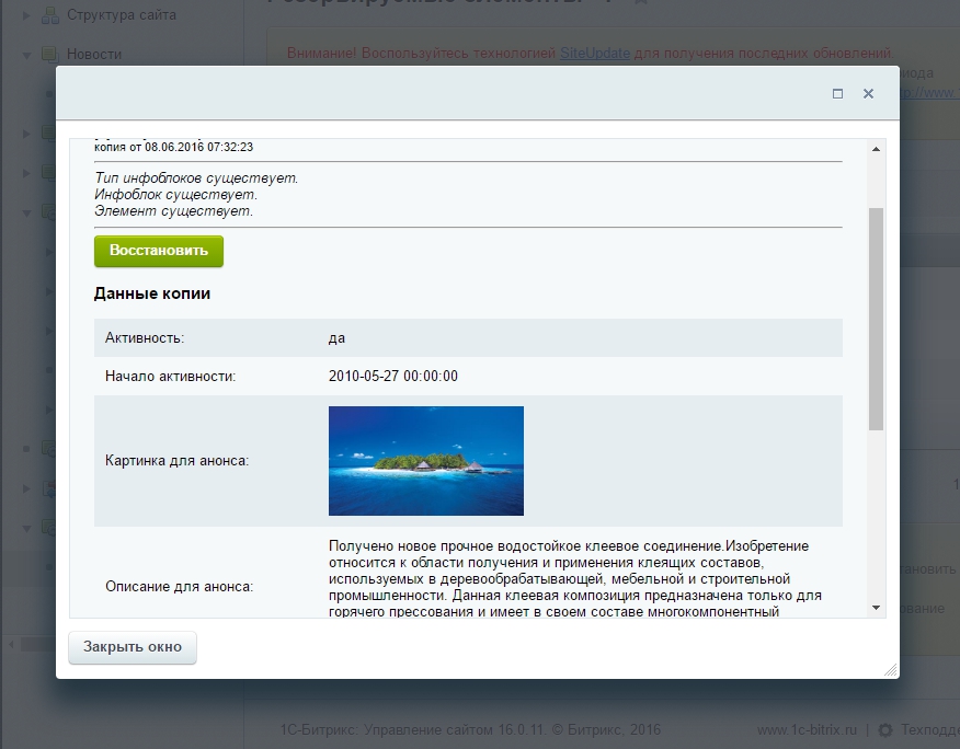 - Партнерам и сотрудникам технической поддержки, так как модуль позволяет оперативно выполнять операции восстановления данных на сайтах клиентов без процедуры восстановления всего сайта из резервной копии, значительно экономя время.