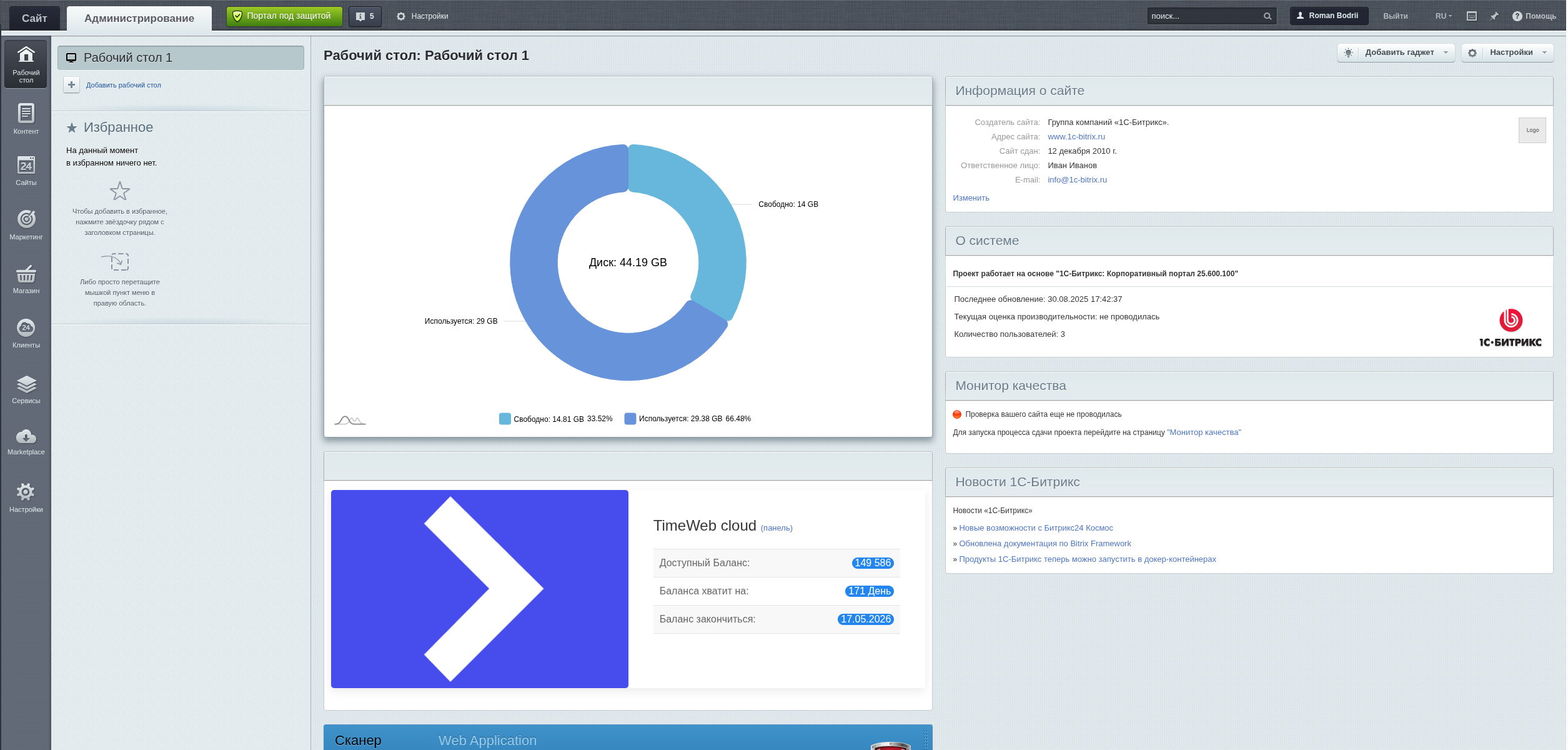 Администратор вашего сайта (или Битрикс24 портала), каждый день видит эти виджеты в административной панели и не сможет упустить из вниманиz критическую ситуацию, когда место на диске будет заканчиваться или баланс вашего хостинга будет подходить к концу.