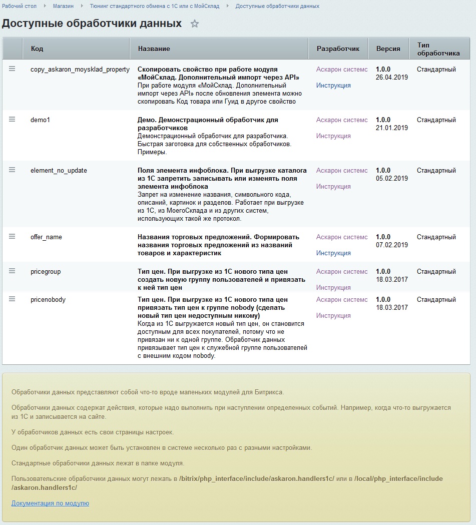 Пользовательские обработчики данных могут лежать в /bitrix/php_interface/include/askaron.handlers1c/ или в /local/php_interface/include/askaron.handlers1c/