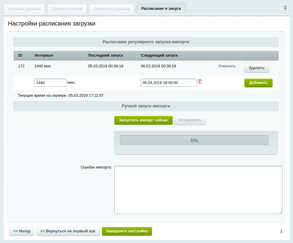 Загрузка по расписанию. Настройте регулярное обновление вашего каталога с помощью функции фонового импорта. Частоту обновления можно настроить произвольно — под ваши потребности.
