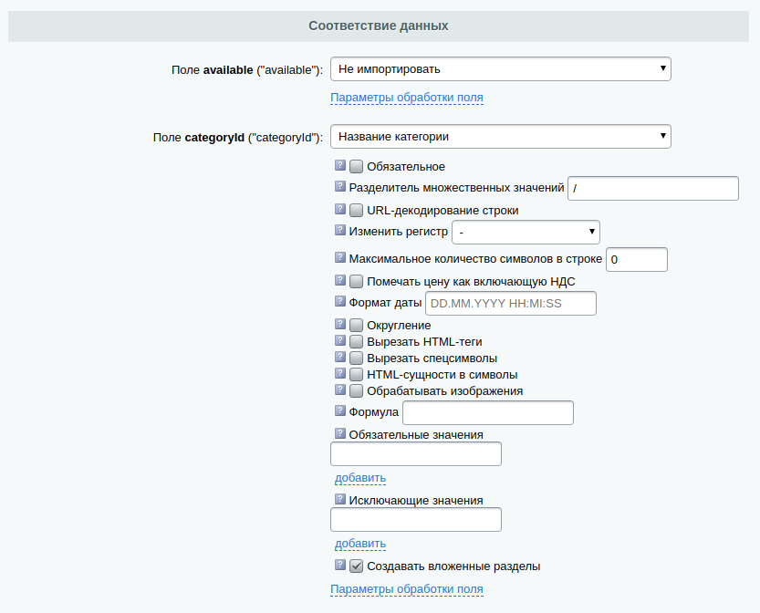 Обработка данных при загрузке. При настройке источника вы можете использовать множество дополнительных опций и модификаторов для предварительной обработки импортируемых данных, прежде чем они будут сохранены в базу вашего сайта.