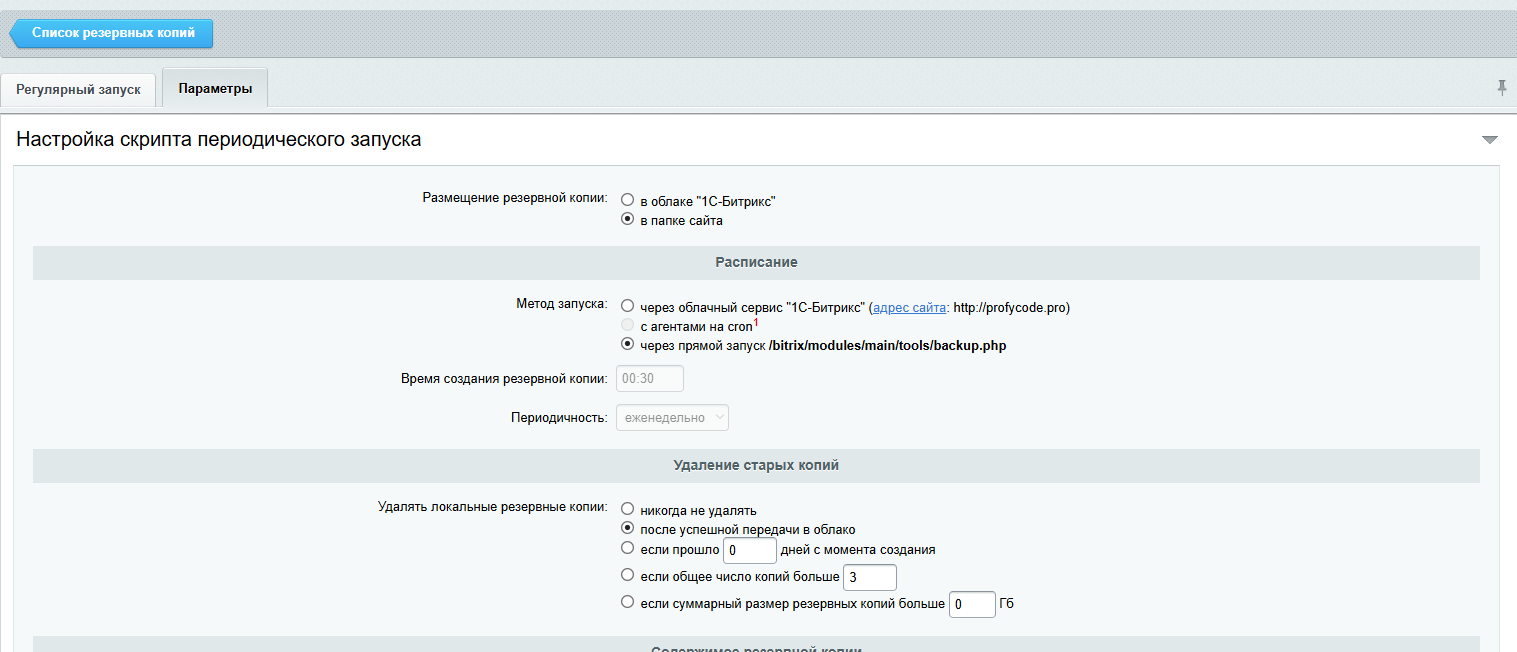 - Совместимость со стандартными настройками резервного копирования в Битрикс