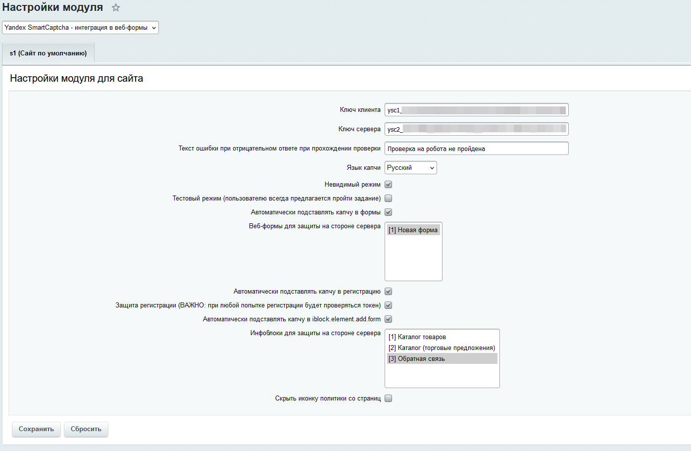 Работает со стандартными компонентами регистрации, формами добавления элементов инфоблоков и веб-формами. Также возможна интеграция в формы из сторонних модулей или в самописные (см. инструкцию для разработчиков в разделе "Установка").