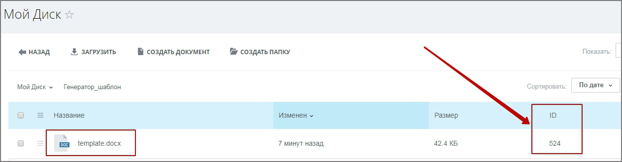 - Путь к шаблону документа — путь к загруженному файлу с шаблоном. Например: /generator/template.docx или 523, где 523 – ID файла на диске. Если в поле прописаны буквы — модуль распознаёт путь, если цифры — находит файл с таким ID;