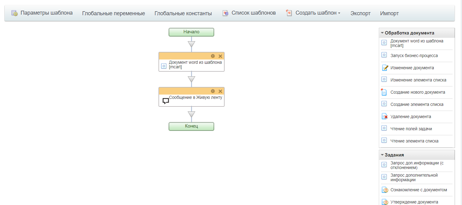 В любом месте цепочке бизнес процесса добавьте активити «Генератор документов» (в системе он может обозначаться как Документ word из шаблона [mcart]):