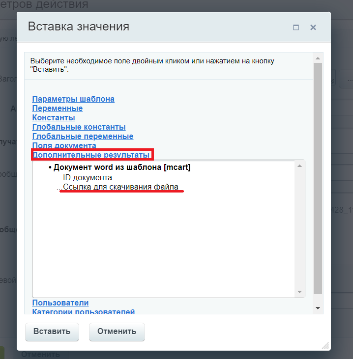 {=A14775_64625_42428_11813:Path}-выбирается через вставку значения в дополнительных результатах значение активити «Ссылка для скачивания документов»