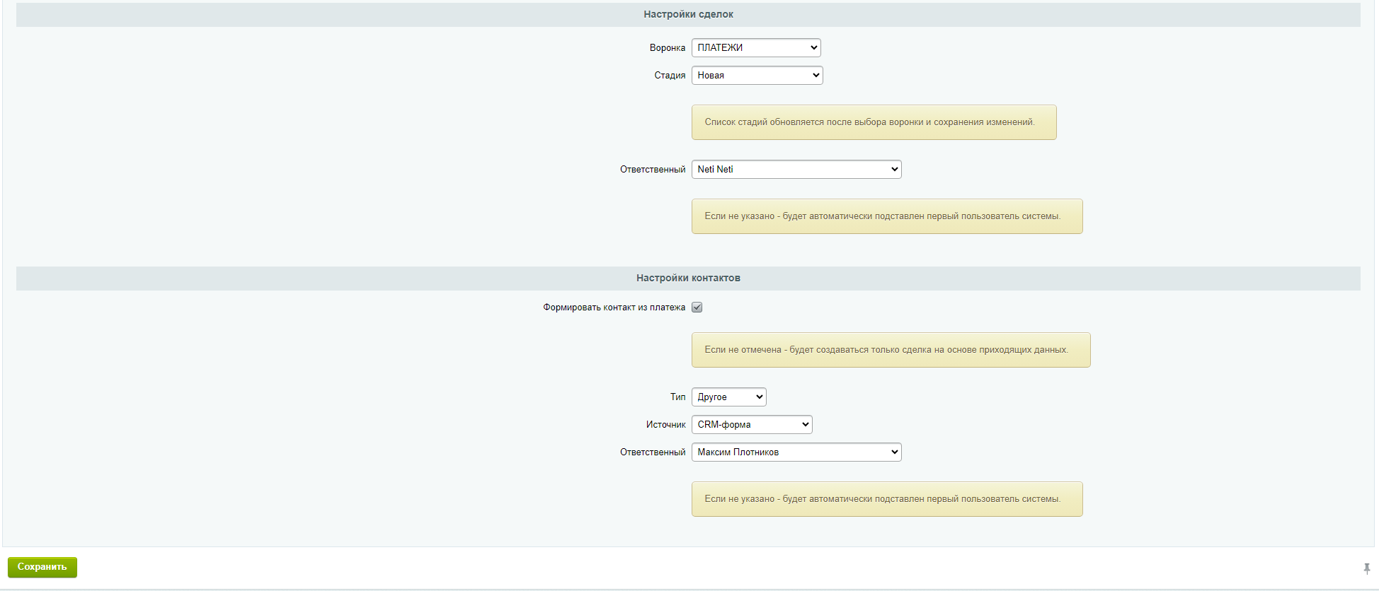 На основе полученных данных создается 2 сущности: сделка (информация о платеже) и контакт (информация о плательщике).