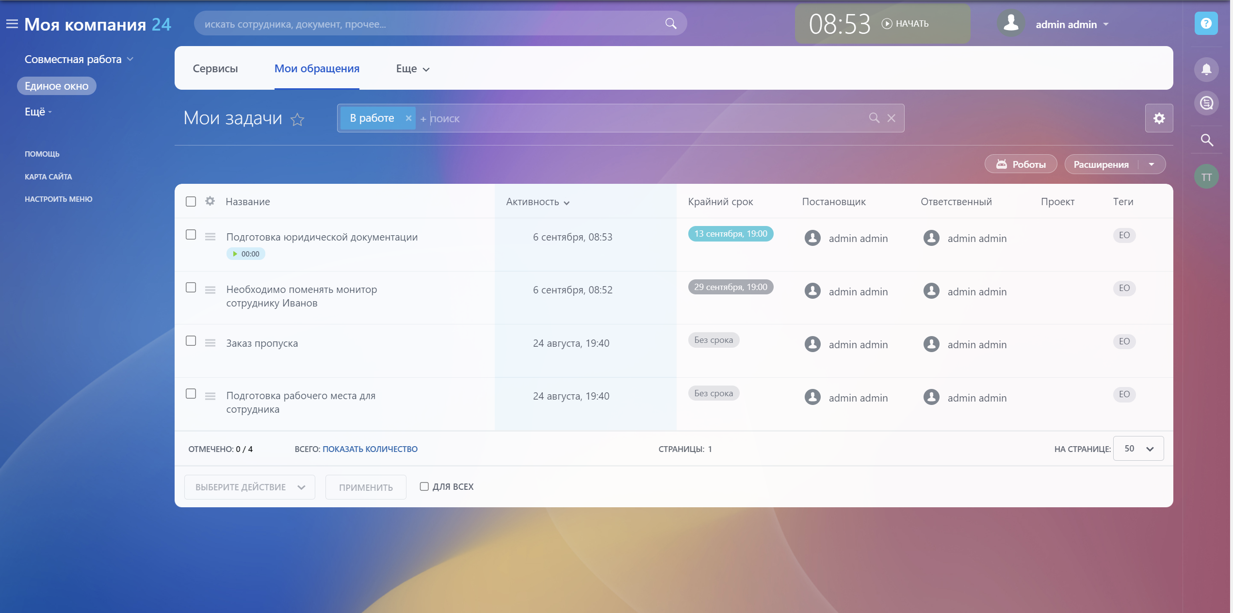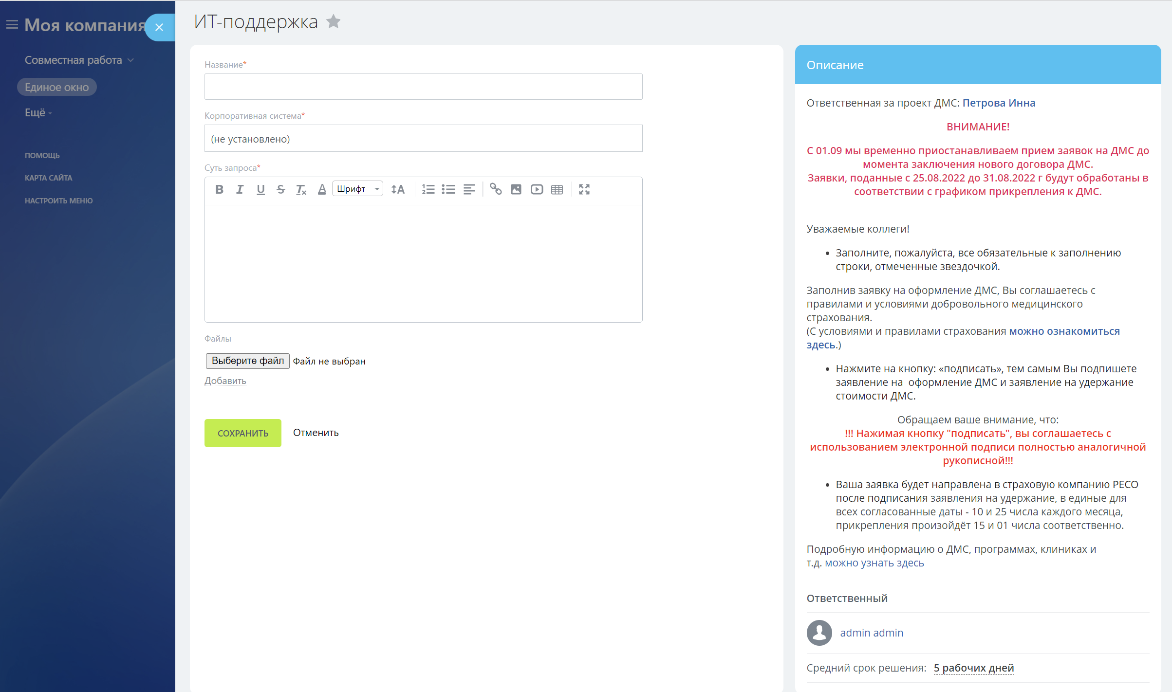 Сервисы – позволяют создать элемент универсального списка и задачу. Задачи, созданные из сервиса, отображаются в разделе «Мои обращения». Поля в левой части сервиса настраиваются и подтягиваются из универсального списка