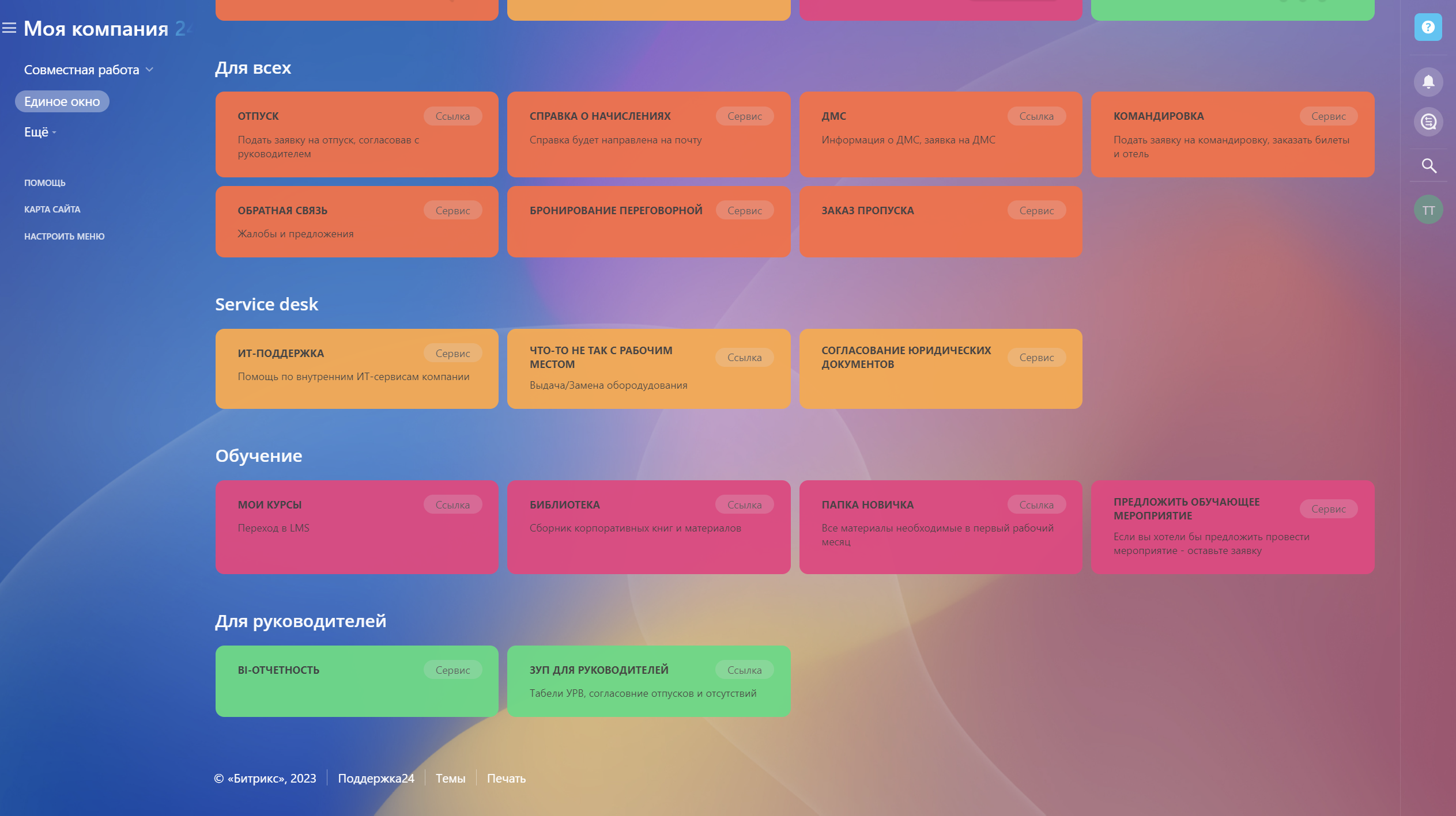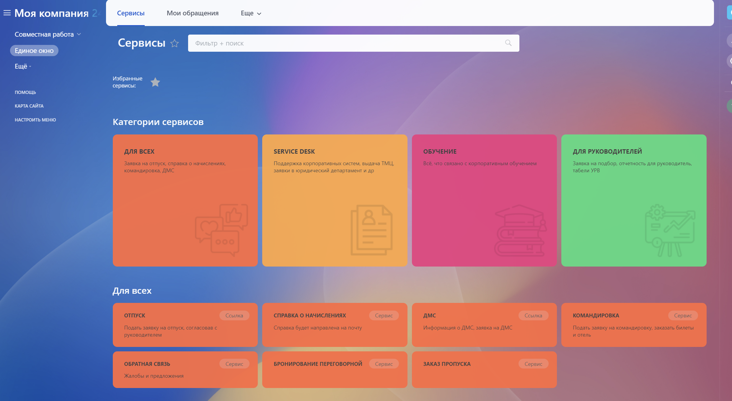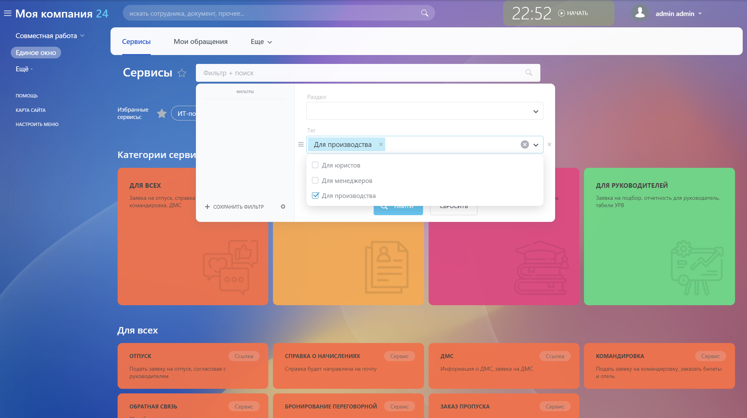 Сотрудники, заходя в раздел «Единое окно», могут найти нужный сервис с помощью фильтрации по Категории, поиска по тегу, либо прямому названию сервиса.