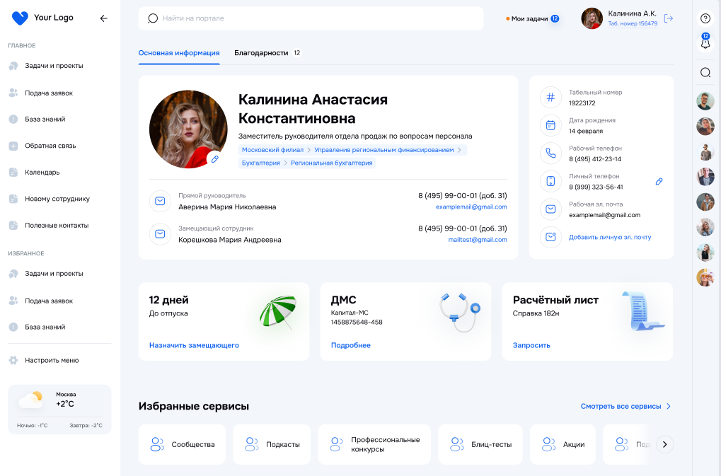 Страница, на которой консолидируется вся информация по сотруднику: личная карточка, полученные благодарности, заявки, напоминания, доступные бонусы, корпоративная активность, регламенты.