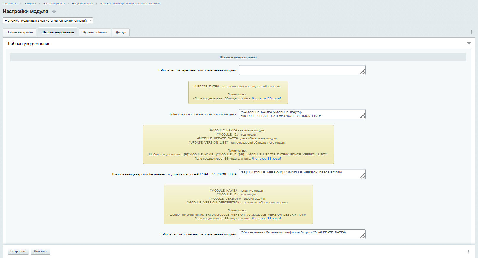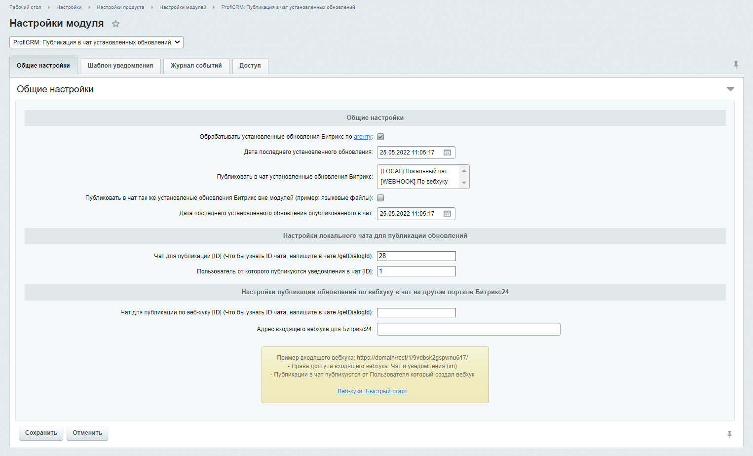Решение предназначено для уведомления пользователей портала об установленных обновлениях модулей Битрикс по средствам автоматической публикации в чат установленных обновлений. В данный чат могут быть добавлены все пользователи Битрикс24 которые заинтересованы в том, чтобы знать какие обновления были установлены.