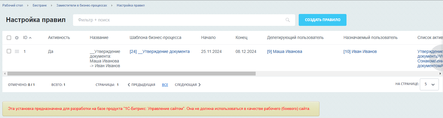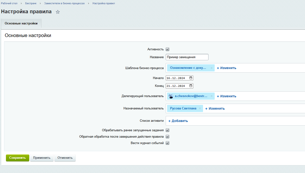 Автоматически переназначать заданий: Если сотрудник ушел в отпуск или заболел, модуль автоматически изменит ответственного за задание бизнес-процесса, обеспечивая бесперебойную работу без необходимости вручную вносить изменения в бизнес-процессы.