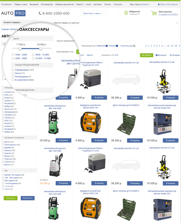 - фасетный умный фильтр по параметрам;