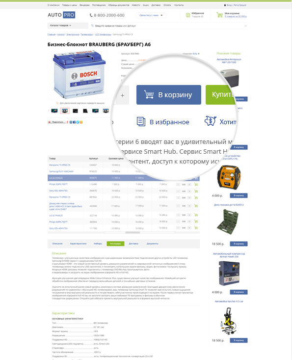 Поле корзины может тянуться по всему сайту: клиент добавляет товары в корзину и сразу видит корзину (реализован принцип заказа, аналогичный в 1С). Кроме того, виджет содержит разделы: «Помощь», «Сравнение», «Недавно просмотренные товары», «Избранное» для быстрого доступа к ним.