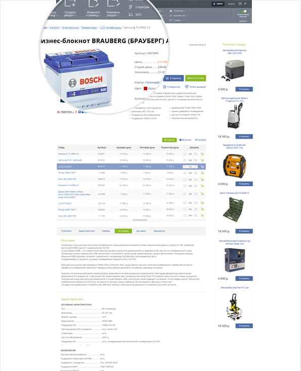 Управляйте содержимым вашего магазина, работайте с товарами и ценами, принимайте и обрабатывайте заказы, гибко настраивайте SEO сайта, платежные системы, способы доставки.