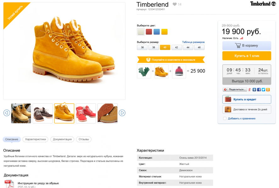 3. Полная поддержка торговых предложений (SKU). У каждого товара может быть несколько размеров, цветов, фасовок и ряда других переменных. Меняя каждую из них, покупатели смогут видеть изменение фотографии, цены на товар и остатки по складам. Для каждого торгового предложения может быть несколько фото. Пример товара с торговыми предложениями