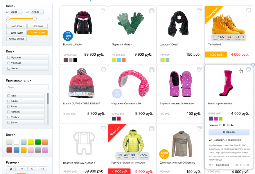 9. Удобный и легко настраиваемый Умный фильтр по параметрам товаров (бренд, характеристики, цвет, пол, возраст, цена, диапазон цен и т.д.). Логика работы фильтра повторяет функционал фильтра Яндекс.Маркет, а также ряда известных интернет магазинов. Существует возможность множественного выбора характеристик. Пример работы умного фильтра