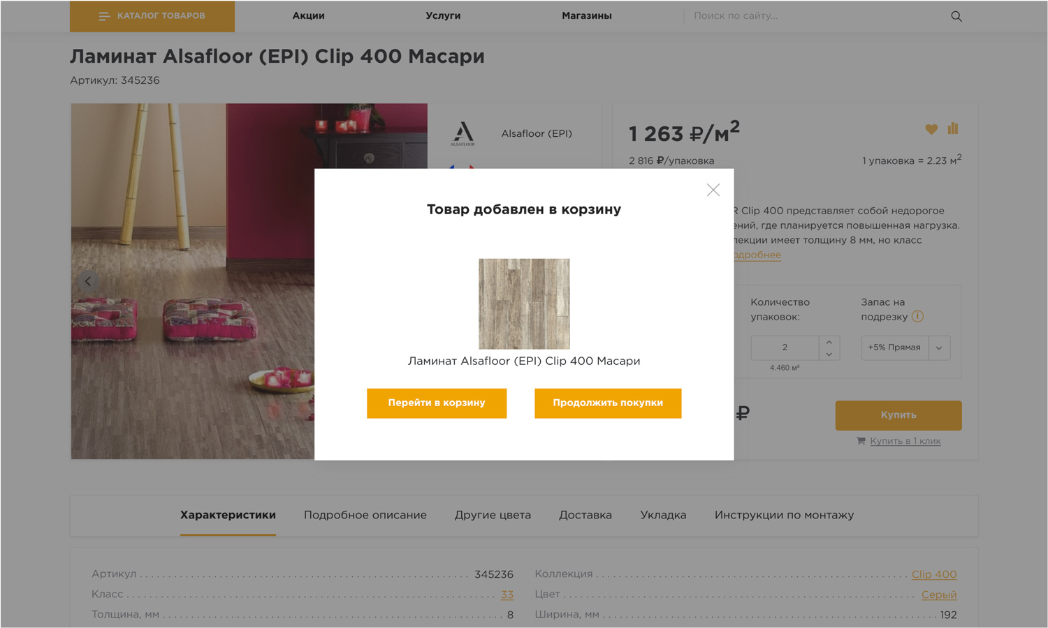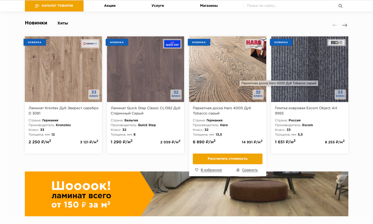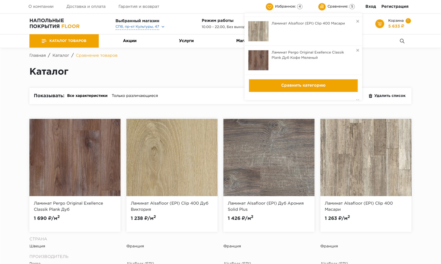 мы реализовали возможность сравнения товаров в рамках категории, ведь не правильно сравнивать ламинат с плинтусом.