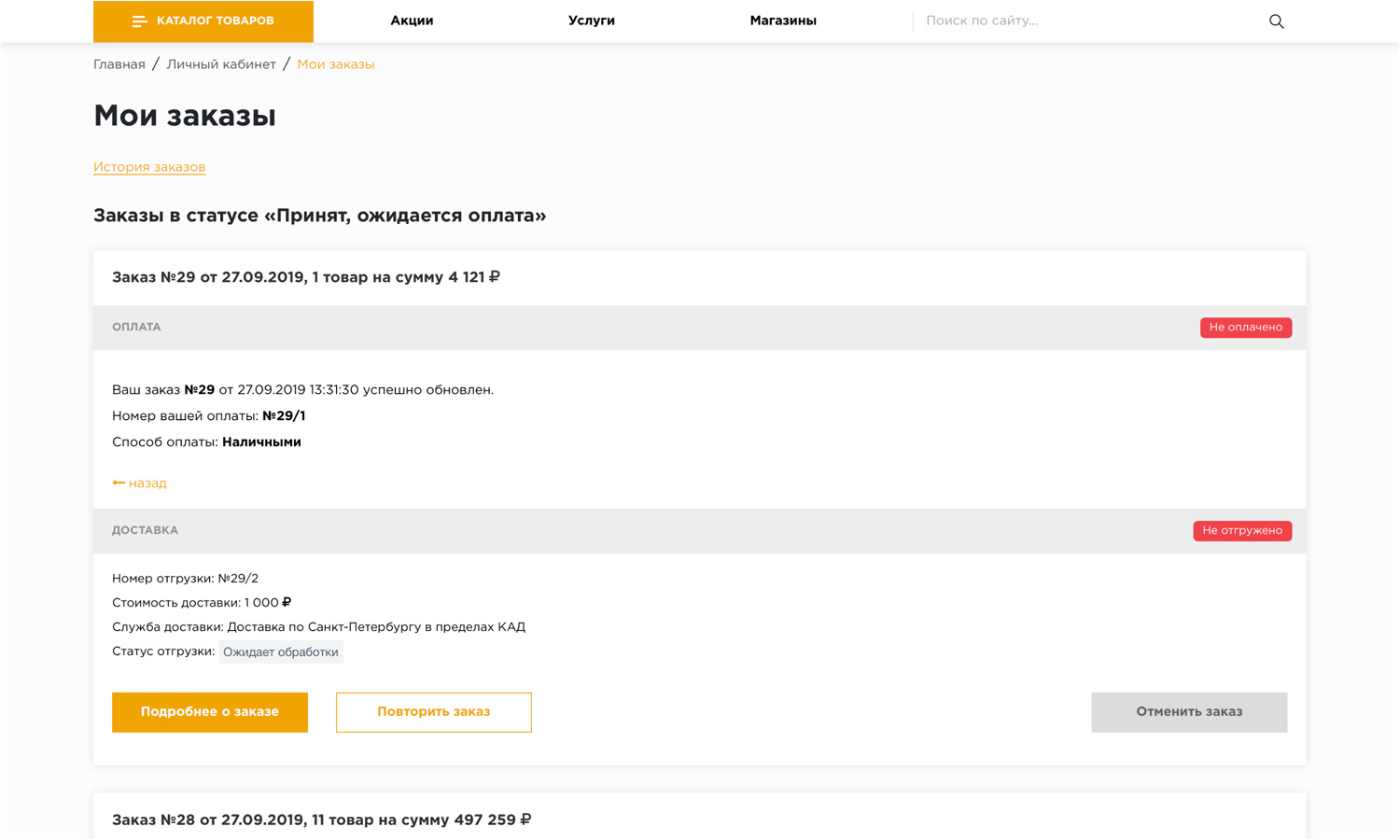 Личный кабинет позволяет следить за историей заказов,