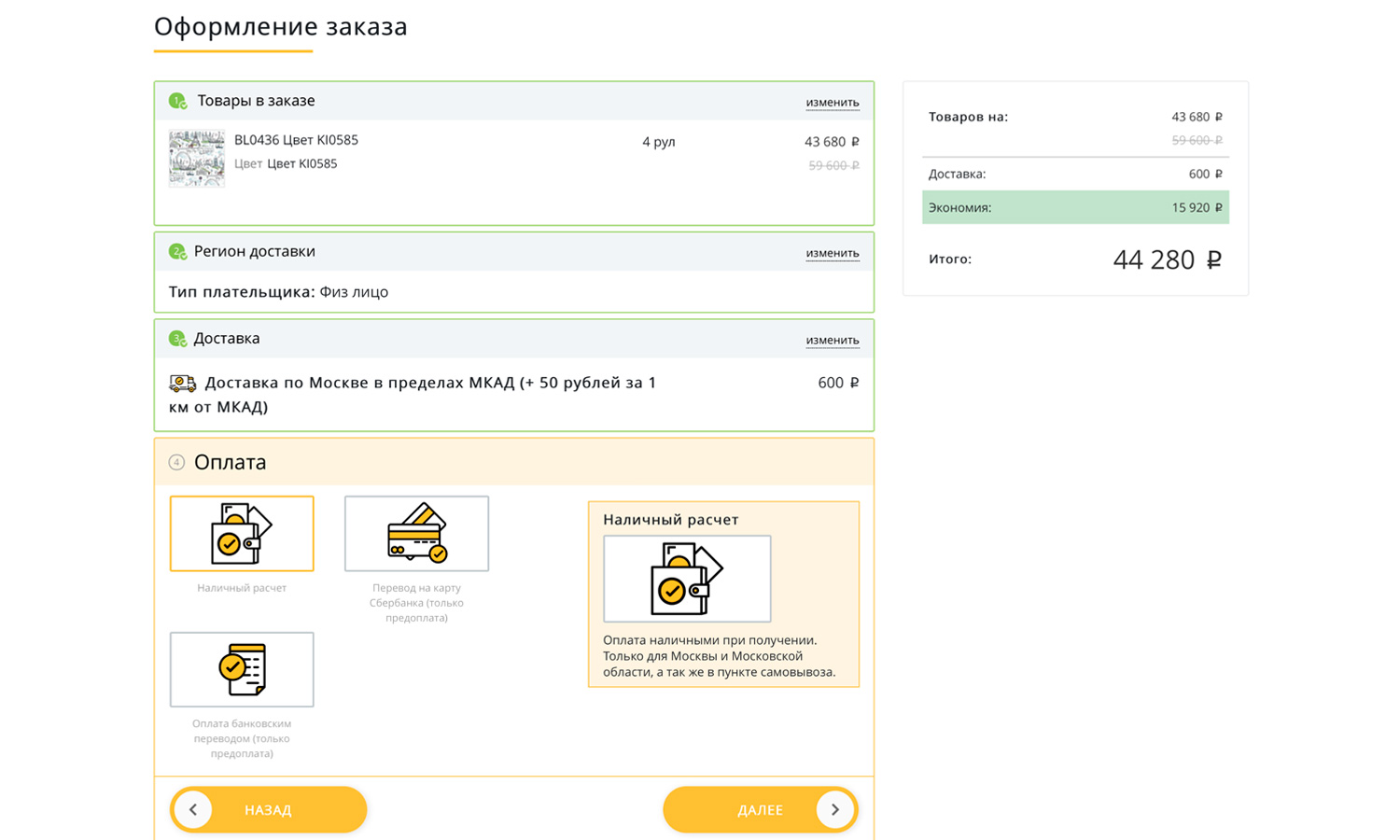 Оформление заказа позволяет за несколько шагов выбрать