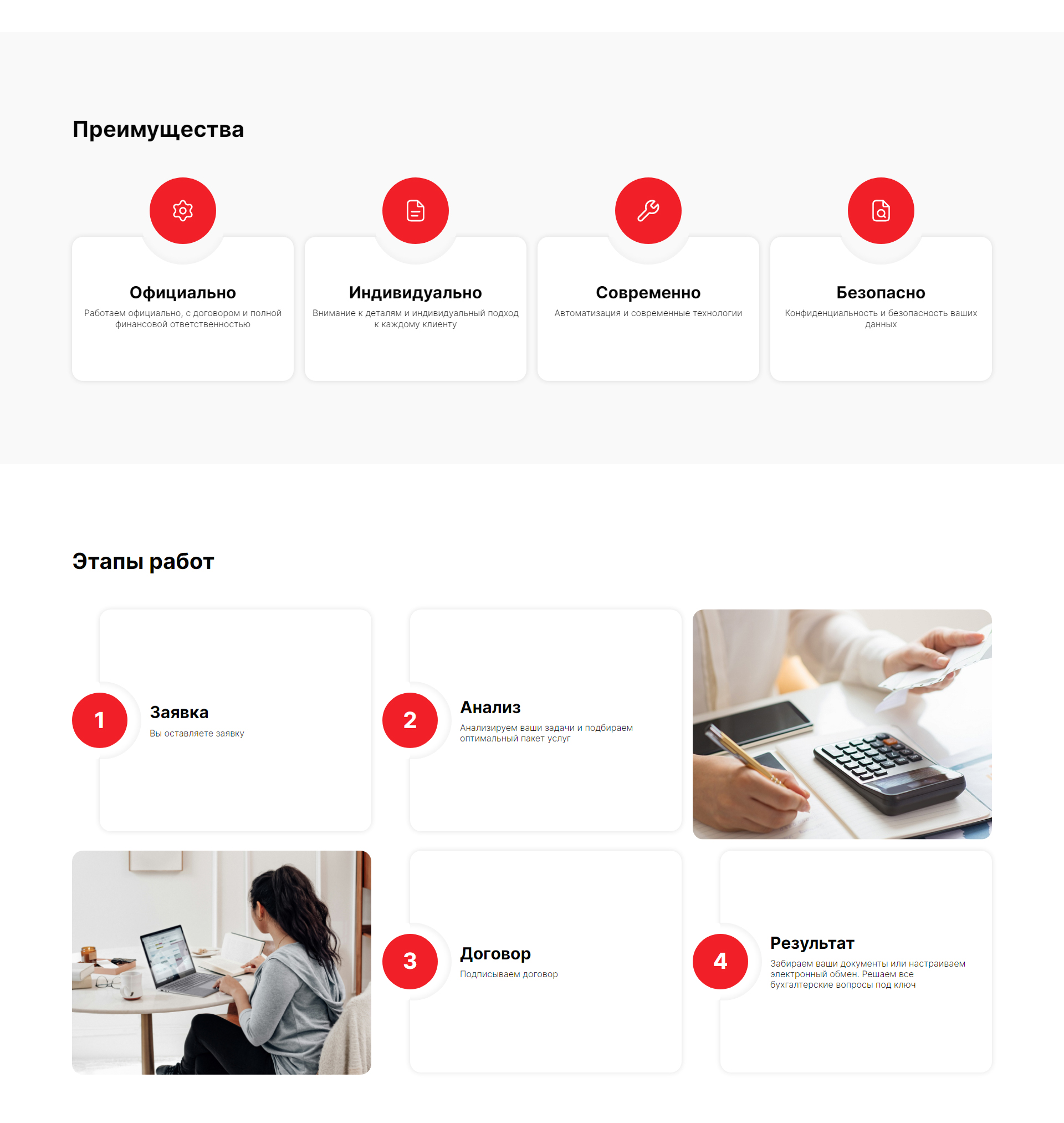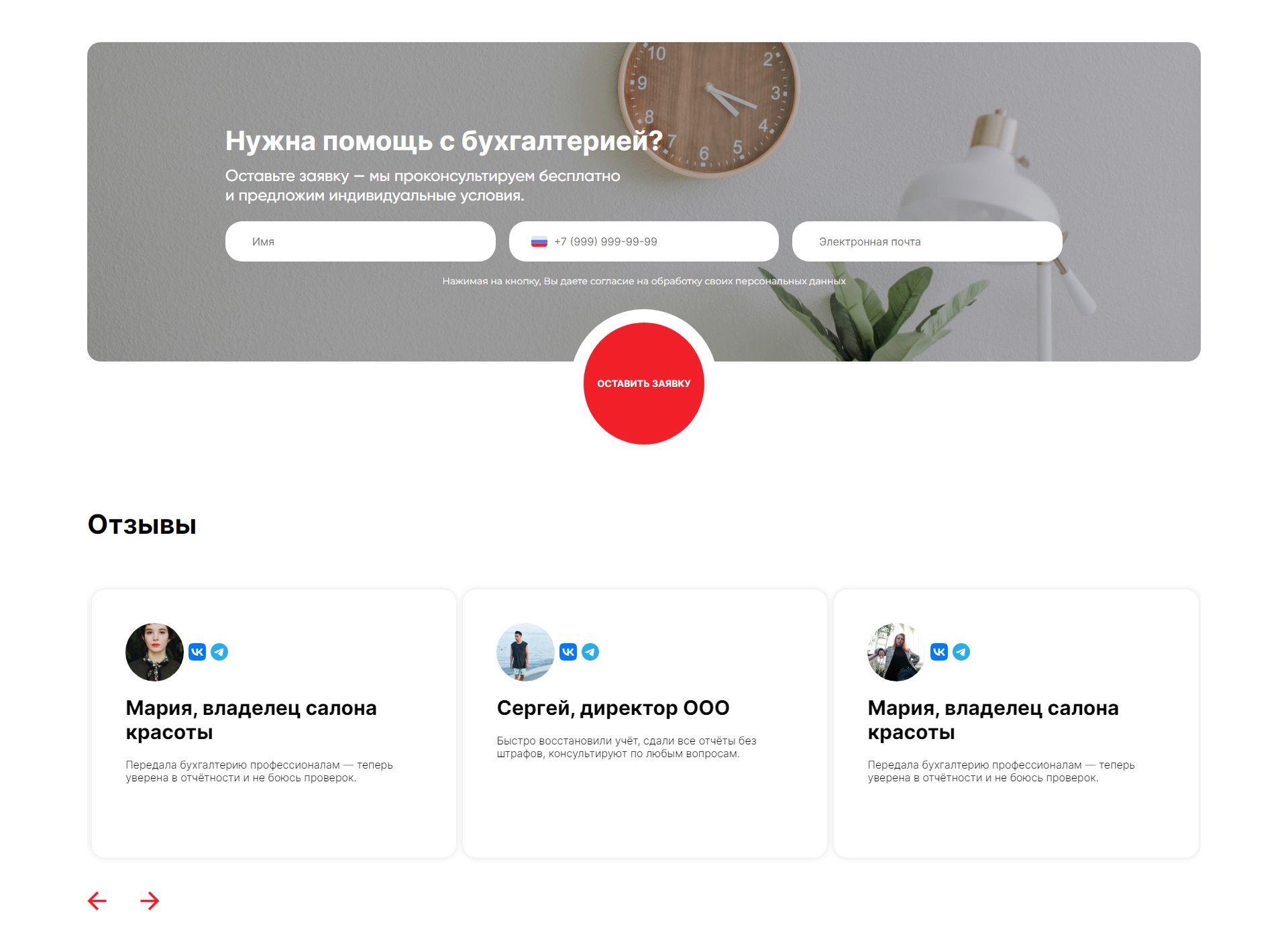 Для бухгалтеров и финансовых консультантов этот лендинг — готовое решение для быстрых запусков. Всего за пару часов вы получаете сайт с нужными разделами: перечень услуг, расценки, формы заказа, отзывы клиентов. Мы объединили основные инструменты продаж, чтобы вы привлекали заявки на бухгалтерскую поддержку и сопровождение бизнеса.