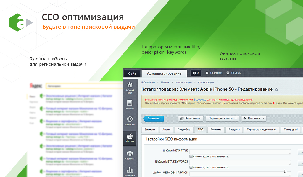 - оптимизирован для SEO-продвижения: можно автоматически создавать уникальные title, description, keywords и т. д.