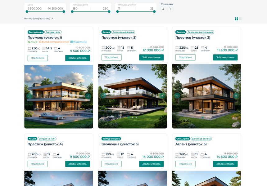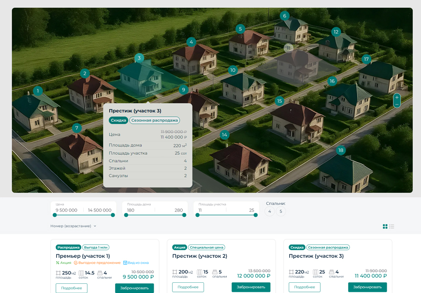 Сайт для продажи коттеджей в загородном поселке, домов в дачном поселке, земельных участков. Удобная интерактивная карта и каталог с фильтрами поиска.