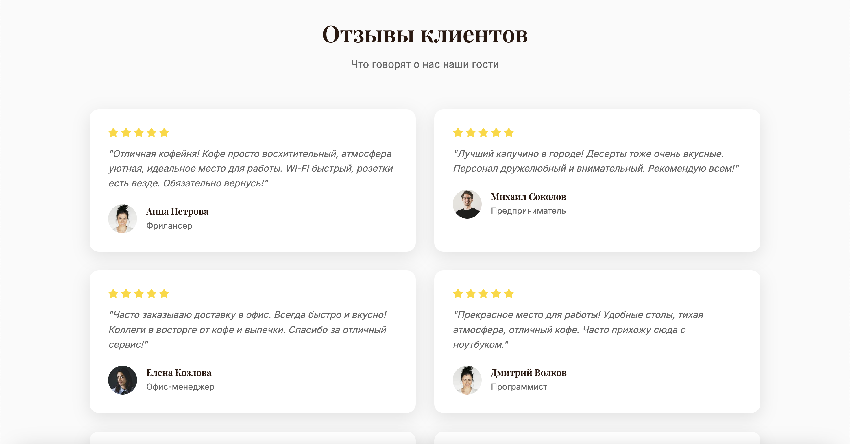 - Три статистических блока (количество кофе, клиенты, опыт работы)