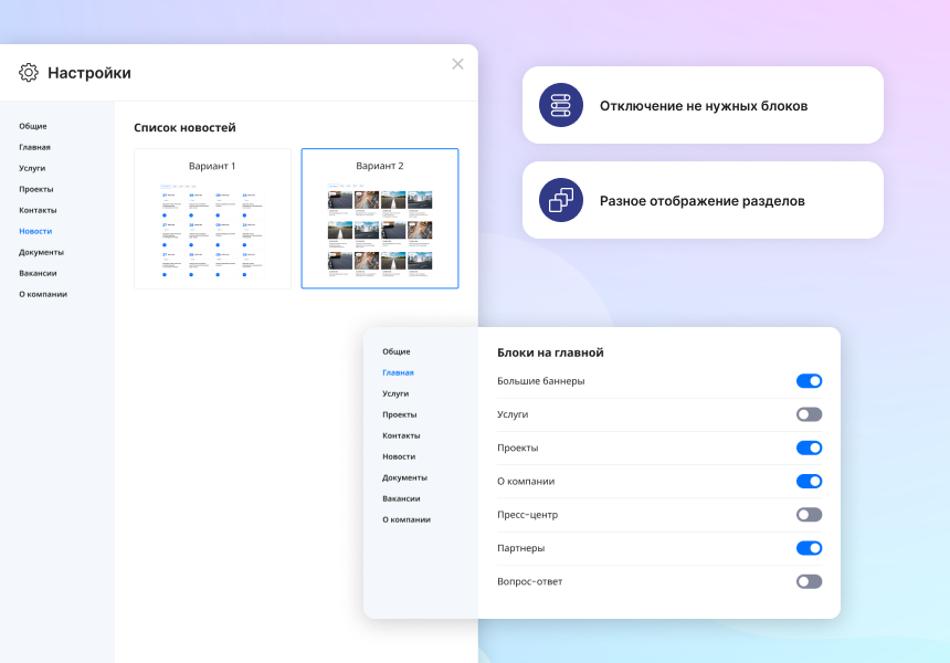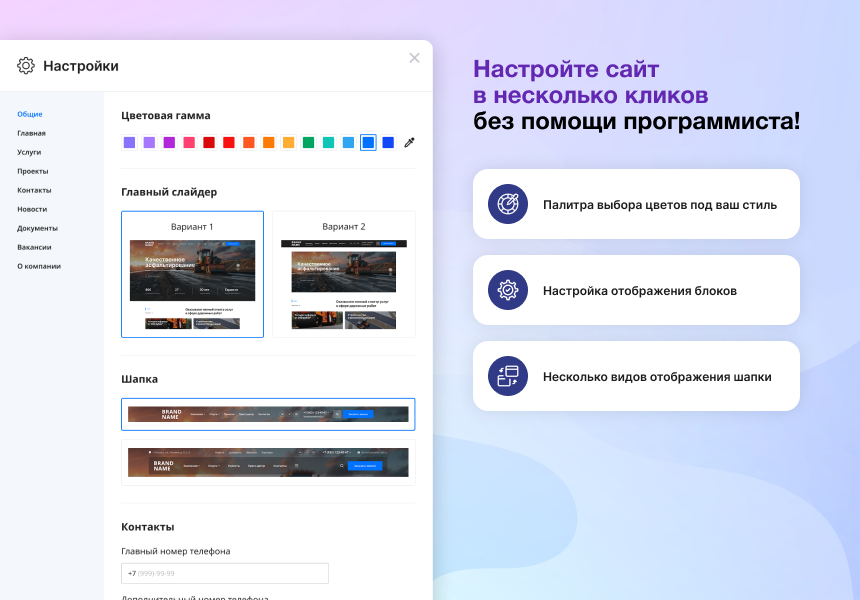 Вы можете задать любой оттенок, изменить компоновку и цветовые параметры верхней части сайта и отдельных блоков. Логотип и иконку сайта можно загрузить непосредственно через интерфейс управления.