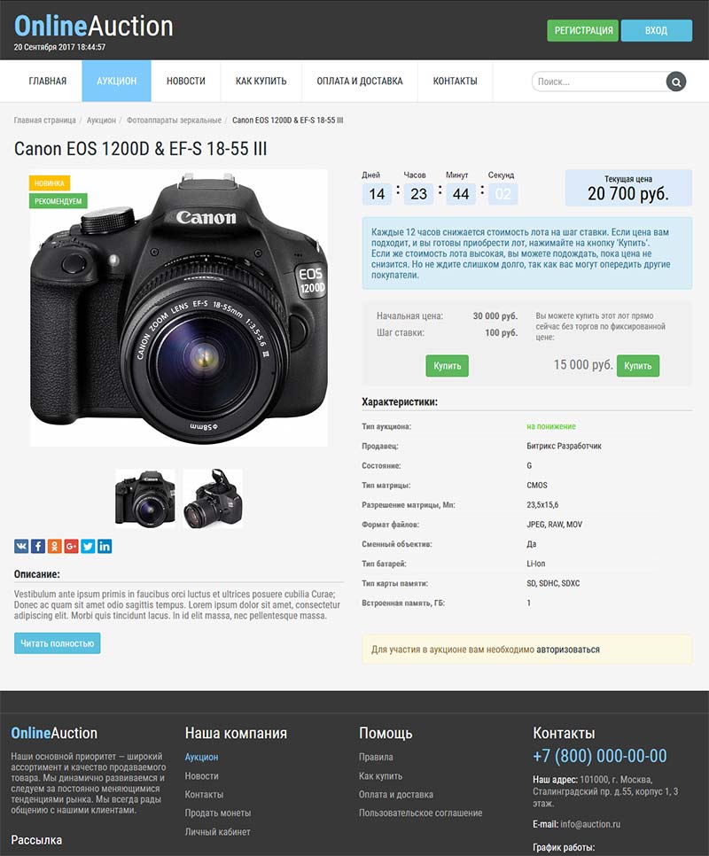 Решение позволяет быстро запустить аукцион на вашем сайте любой тематики. В качестве демонстрационных данных используется техника.