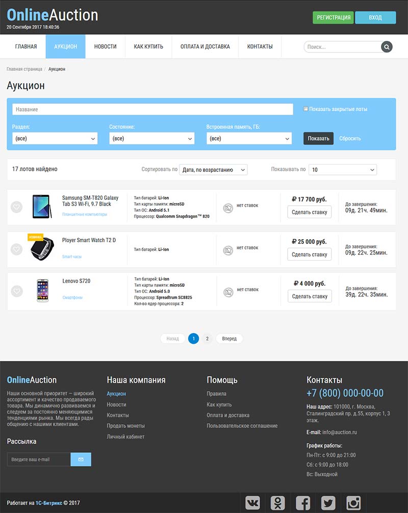 - продающая главная страница (Новинки, Рекомендованные лоты, Закрывающиеся лоты, Новостная лента и Краткая информацию о сайте)