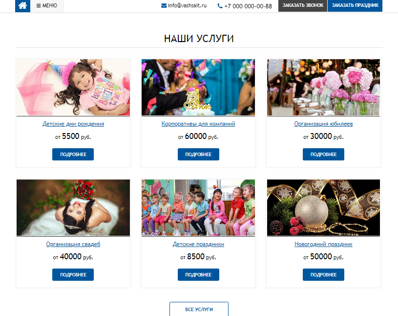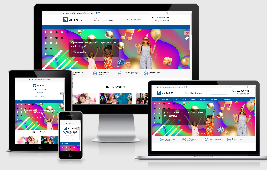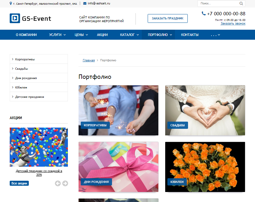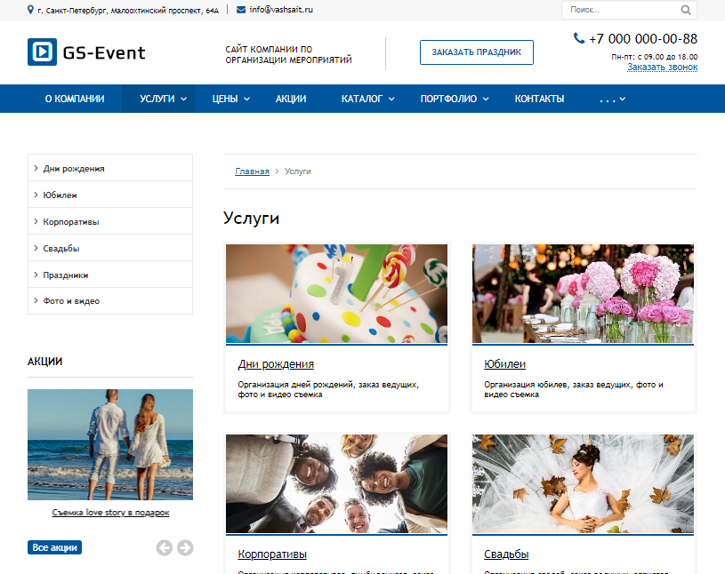 «GS: Event - Корпоративы, праздники, свадьбы + каталог» – современный универсальный сайт для компаний и индивидуальных предпринимателей. Возможная интеграция: организация праздников, проведение мероприятий, организация свадеб, организация корпоративов, новогодние праздники, тамада, ведущий, диджей, эвент агенство, магазин шариков, игры, развлечения, спортивные мероприятия.
