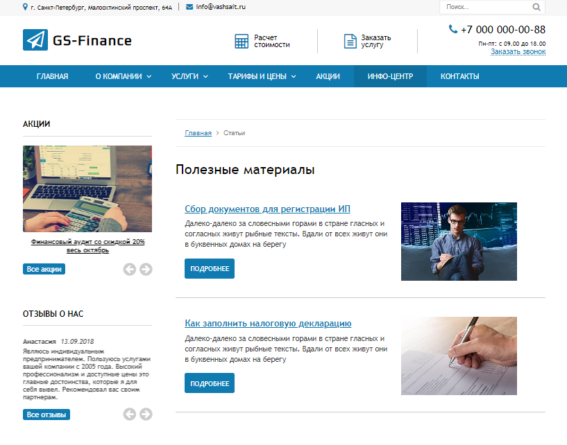 "GS: Finance - Бухгалтерия, Консалтинг, Аудит" – современный универсальный сайт для компаний и индивидуальных предпринимателей. Возможная интеграция: бухгалтерские услуги, консалтинговые услуги, аудиторские услуги, юридические услуги, бизнес-услуги, аутсорсинговые услуги, страховые компании.
