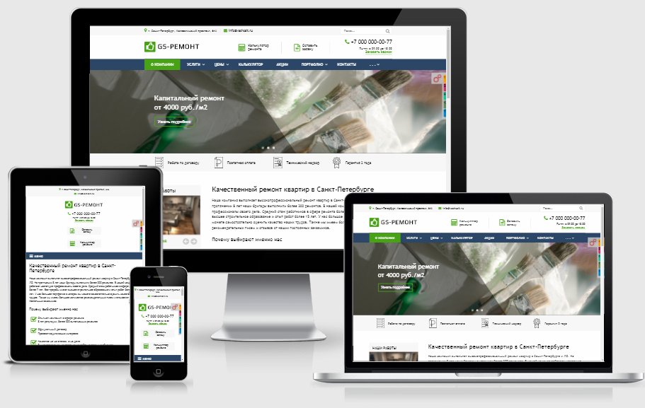 Адаптивный сайт. Мы создали отзывчивый адаптивный сайт, который отлично будет смотреться на всех устройствах: мониторы, ноутбуки, планшеты, смартфоны, и др. гаджеты