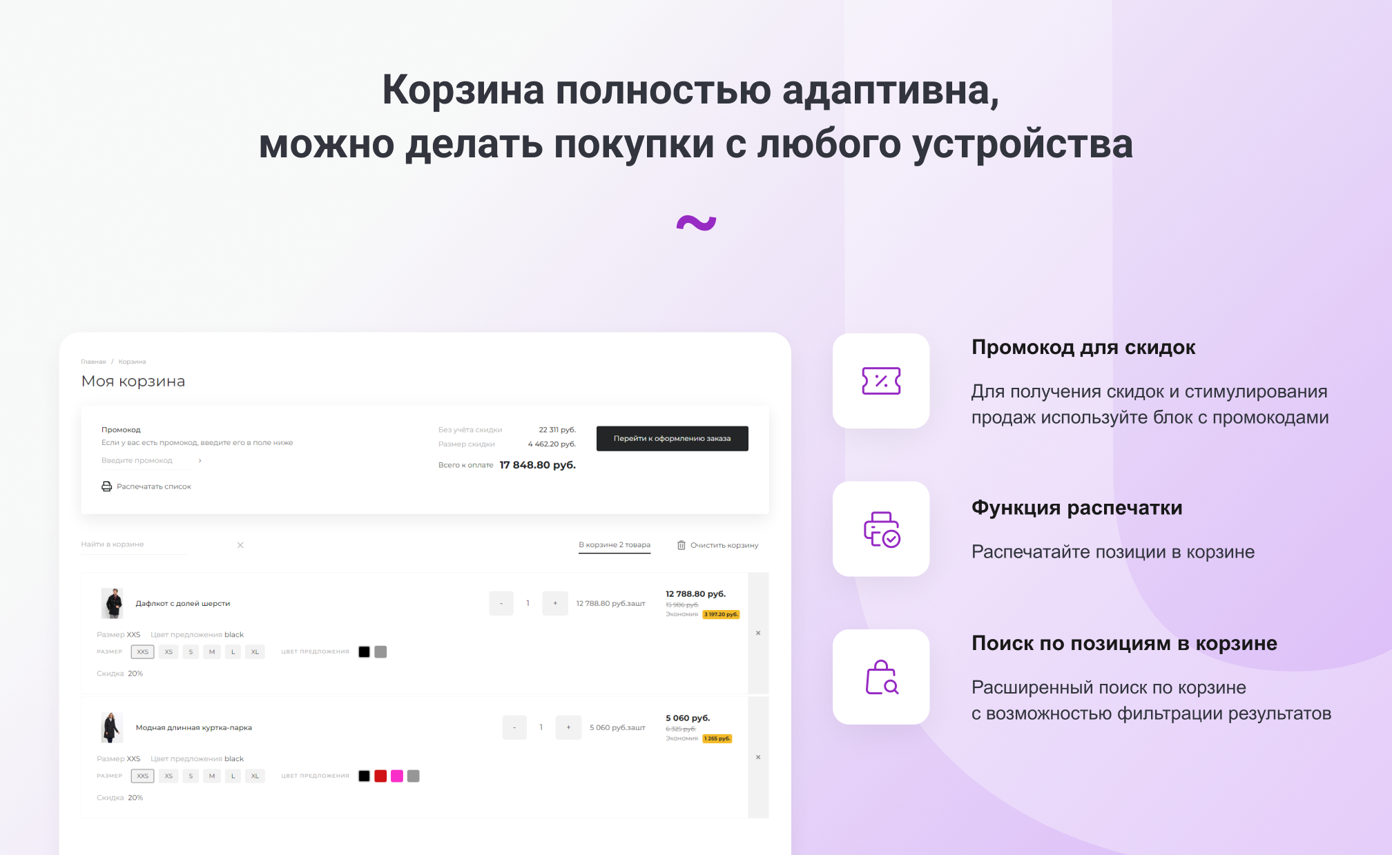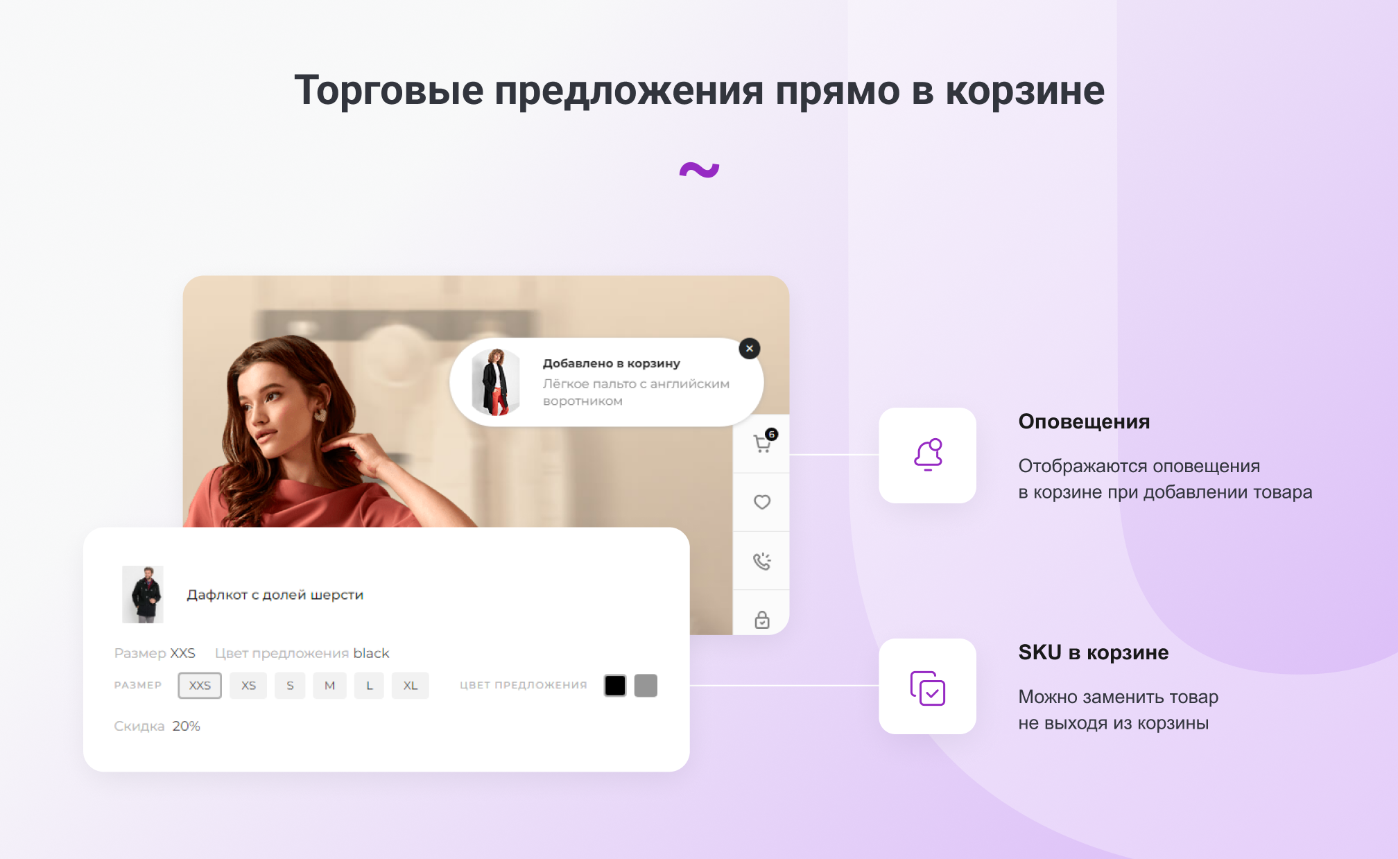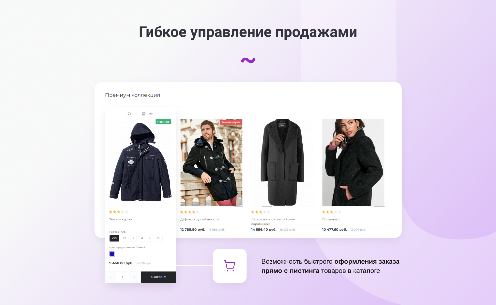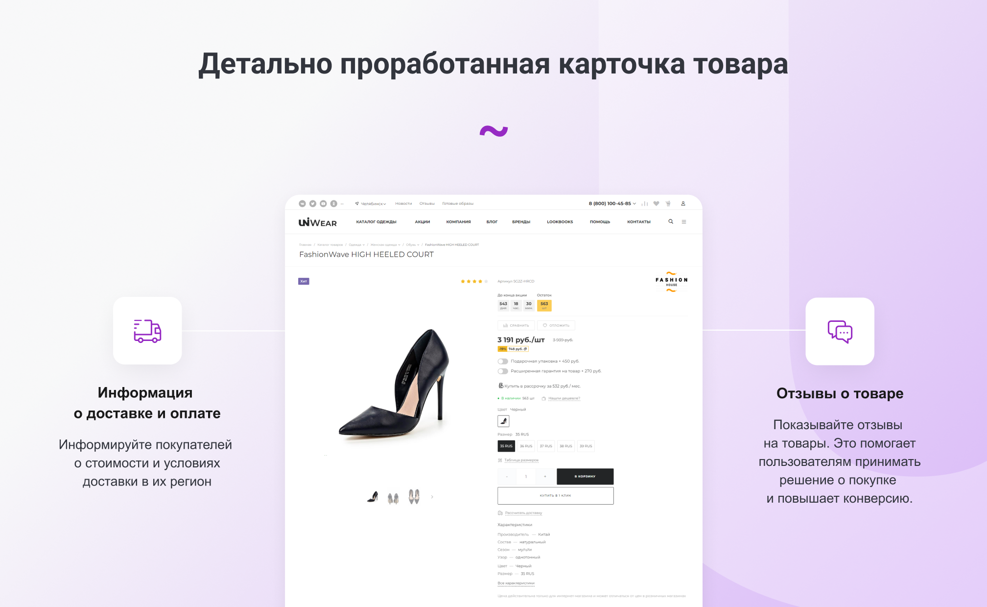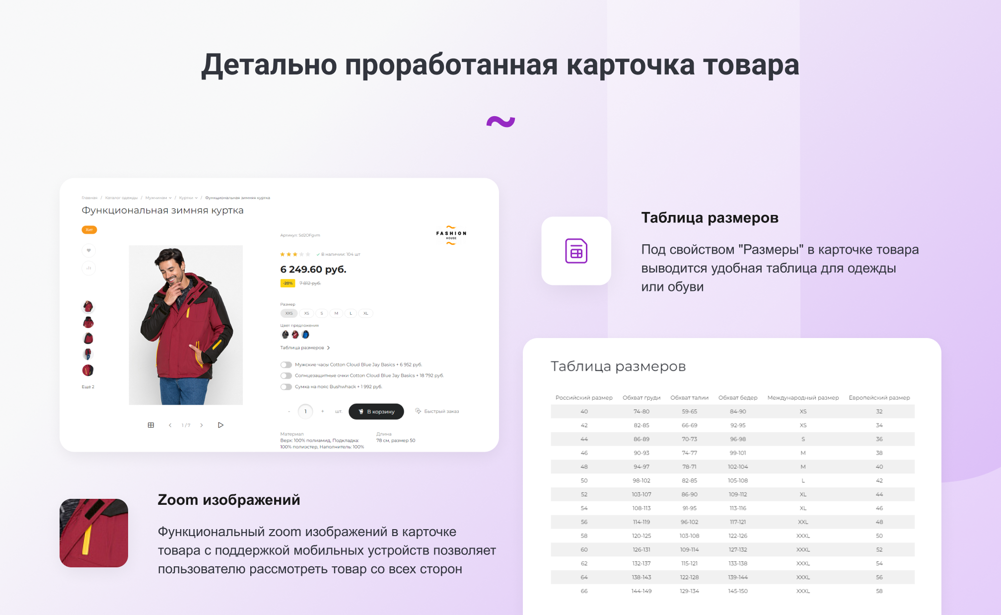 Решение создано с учетом потребностей fashion-индустрии: специализированный каталог и карточка